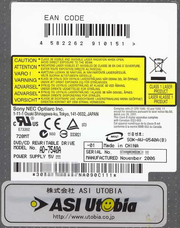 ソニーNECオプティアークより発売のスリムドライブ「AD-7540A」です。