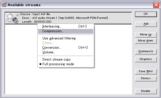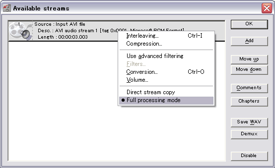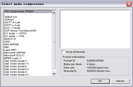 最近のプレイヤーはCodecを内蔵しているものが多く、ついそれに頼ってしまいがちで、 編集時に「読み込めない」と困ることがありがちです。 そういった問題を解決してやりましょう。 ビデオクリップ(Aviファイル)の場合 極窓 (入手先:赤の館 様) を使用します。 (本来なら「真空波動研」を用いるのが早いのでしょうが…) まずは起動後、テキスト表示モードに切り替えましょう。 ![]() 次に、対象のファイルを読み込みます。 ○で囲った部分にドロップしてやりましょう。 ![]() 読み込んだファイルをシングルクリックしてやると、ヘッダ情報が表示されます。 表示されたヘッダのvidsの部分で、Codecが判定できます。 ![]() 【wmv3】と表示された場合 【DIVX】/【divx】と表示された場合 【div3】と表示された場合 【mp43】と表示された場合 【mp42】と表示された場合 【xvid】と表示された場合 【vp62】と表示された場合 その他の未知のCodecが表示された場合 ogmファイル、mkvファイルの場合 VirtualDubModを使用して読み込み、Aviファイルに変換します。 まずはファイルを開きましょう。 ![]() Video→Direct Stream copyにチェックを入れます。 ![]() Stream listを開きます。 ![]() 音声ストリームを右クリックして、Full processing modeにチェックします。 ![]() compressionの設定ウインドウを開きます。 ![]() No Compression(PCM)を選択して「OK」を押しましょう ![]() F7キーを押してAviファイルを出力します。「ファイルの種類」をaviにしておくことを忘れないように。 ![]() Aviファイルに出力が完了したら、上の「ビデオクリップ(Aviファイル)の場合」も忘れずに実行しましょう。 Mpgファイル、WMVファイルの場合 TMpgEncでwmvファイルを読み込んだ後、「プロジェクトの保存」でtprファイルを出力しておきましょう。 ![]() |