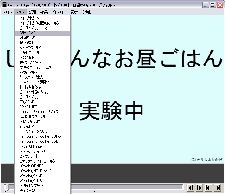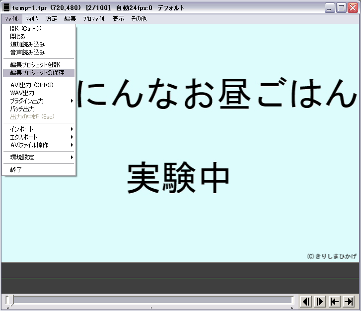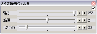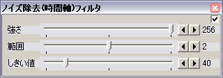 時間軸に作用するフィルタですので、動きのある画像を用意しました。 見てもらえれば分かると思いますが、ざらざらしたノイズに対しては非常に強力です。 TV放送等で発生しているざらざらしたノイズを除去するのに向いています。 フィルタリングの作業が終了したら、最後に「編集プロジェクトの保存」でaupファイルを出力しておきます。 ![]() |