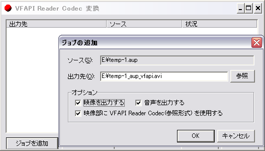 Vfapi Reader Codecを入手し、VFAPIConv.exeを起動します。 「ジョブを追加」より先程出力したaupファイルを読み込み、「実行」で参照形式のAviファイルを出力します。 ![]() 出力先のファイルが生成されたことを確認しましょう。 |