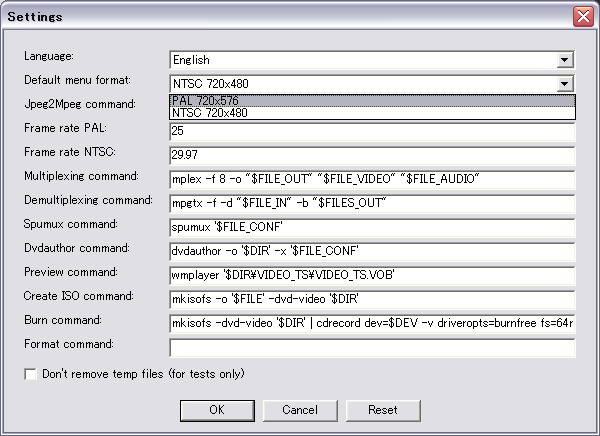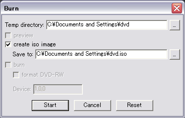DVDStylerをダウンロード後、インストールして起動します。 <0>まず始める前に 海外のソフトですので、デフォルトの設定がPALになっています。 日本の規格はNTSCですので、「Configration」→「Settings」よりNTSCへ変更しておきましょう。 ![]() <1>タイトルの読み込みとチャプタ生成 ![]() 図の↑部分に、Dのステップで生成したmpgファイルをドロップします。 ファイルが複数ある時は、順番にドロップしていきましょう。 ドロップしたタイトルを右クリックして、「Propaties」を開きます。 ![]() Vob Chapters;の欄にチャプタ位置をカンマ(,)で区切って入力します。 例えば、1分11秒地点と7分35秒地点にチャプタを打ちたい場合…… 0,1:15,7:35 と入力すれば良いわけです。 <2>メニューの作成 ![]() 「Backgrounds」のタブを押すと、背景集が表示されます。 ダブルクリックで背景を選択すると、メニューに背景が付きます。 「Directories」からファイルを直接参照することで、オリジナルの背景を使用する事もできます。 しかし、いちいち参照するのも面倒ですので、よく使う画像を背景集に加えておくと良いでしょう。 DVD Stylerのインストール先の「backgrounds」フォルダ内に入れておく事で、DVDStylerの背景集として認識されます。 ちなみに、Titleの隣にある「Menu 1」のプロパティから、単色背景のメニューを作成することもできます。 下段ウインドウを右クリックするとメニューを複数生成することも可能ですので、階層メニューが作成できます。 <3>テキスト装飾 ![]() 表示部を右クリックするとメニューが表示されます。 Add→Textを選択することで、メニュー画面内に字が書けます。 最初はTextと表示されています。Propatiesで文字を変更してやりましょう。 ![]() ![]() 「Text」のボックスに好きな文字を入力してやりましょう。 フォントやカラーの変更も可能です。 但し、日本語のフォント(MSゴシック等)に変更せずに全角文字を使うと文字化けしますので注意しましょう。 <4>画像の挿入 2で画像の説明をしましたが、ダブルクリックせずに表示部にドロップを行なうと、背景ではなく画像として扱われます。 ![]() あまり意味無い気がしますけどね。 <5>リンクボタン さて、それではいよいよタイトルへリンクさせてみましょう。 ![]() 「Buttons」のタブを開き、「Button」のイメージが表示されたら、それを表示部へドロップします。 表示部にButtonが表示されたら、それを右クリックしてプロパティを変更しましょう。 ![]() 「Action:」……ボタンを押した時の動作です。 jump title 1;ならTitle1の映像を再生しますし、jump menu 1;ならMenu1へ移動します。 「jump title 1 chapter 2;」のように手書きで加えてやれば、直接チャプタへリンクする事も可能です。 「Text:」……ボタンの文字表示です。「Play」等、好みの文字に変更しましょう。 「Text Color/BG Color」……通常時/ハイライト時/選択時のテキスト/背景の色を選択します。 「Left/Right/Up/Down」……メニュー内にボタンが複数ある場合、上下左右のキーを押した時 ハイライトがどこへ移動するかの設定です。 通常はAutoのままで問題ないでしょう。 <6>作成例 こんな感じでリンクさせてやると良いでしょう。 ![]() <7>isoイメージの出力 ![]() File→Burn dvdでisoイメージの出力画面を開きます。 ![]() create iso imageにチェックを入れて、「Start」で出力を開始しましょう。 |