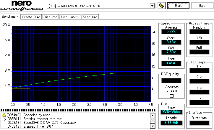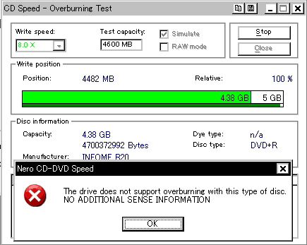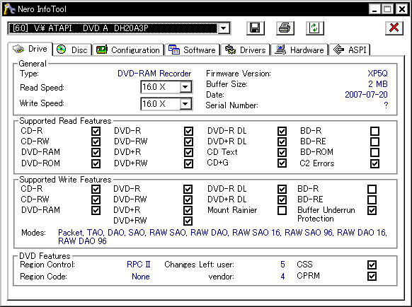 ・Windows上で認識するドライブのベンダ名は「LITEON」ではなく「ATAPI DVD A」。 ……と思ったんですが、どうも海外のフォーラムでは普通に16倍出るよ報告が多く発生しており、私も気になって他に5枚ほどディスクを変えてみた所 うち2枚は8倍速、1枚は12倍速、そして残り2枚は16倍出るという変な結果に。海外系メディアの焼きも安定しないですし、どうも私の購入した個体が本格的に不良品なのか、 それでなくともかなりのハズレ個体なんじゃないかっていう疑惑が強まってきました。…いやでもこれ多分交換には出せないんですよね。一応誘電16倍はちゃんと焼けてるから・・・orz 16倍出なかったり。 ![]() あっさりと16倍出たり。もう意味不明。 ![]() ・エラー計測はこれまでのLITEONドライブと同じく可能で、AdvancedのタブでJitterのチェックもできる。しかしいざチェックしたまま実際に計測しようとすると、PIE/PIFの計測は問題なく終了するものの、Jitterの計測に差し掛かった時点でエラー表示になり計測が止まる。 ・DVD+Rのオーバーバーンは非対応。CD-Rは未確認 ![]() ・初期ファームXP5Qのリリースデートは2007/7/20 20:51。 既にこれより新しい2007/7/25 12:29のXP5Rというファームウェアが公式からダウンロードできる。 ![]() ![]() |