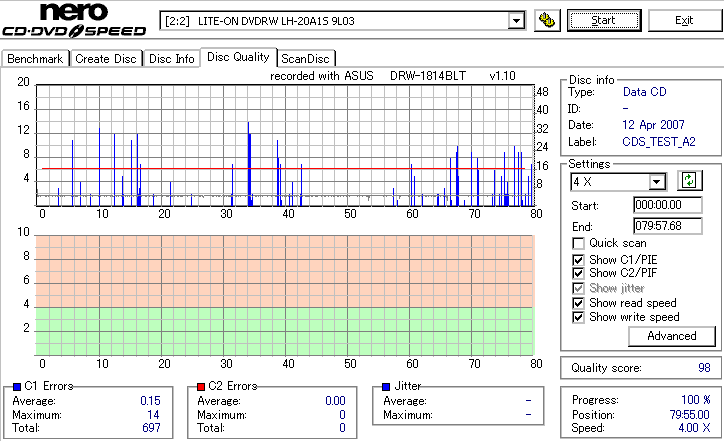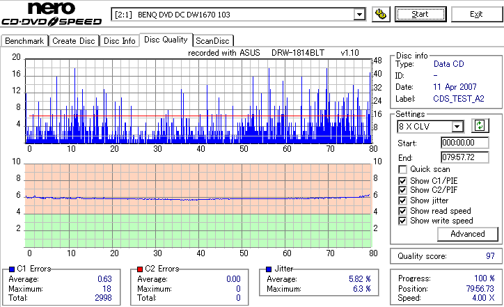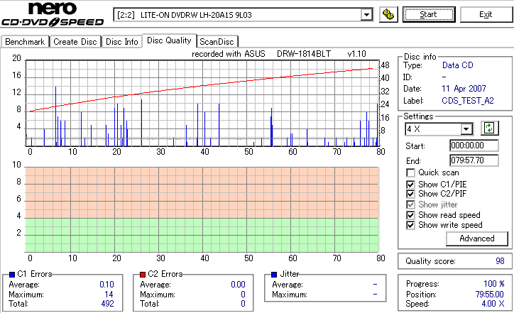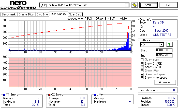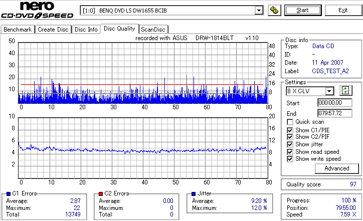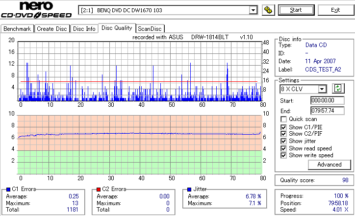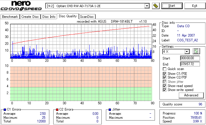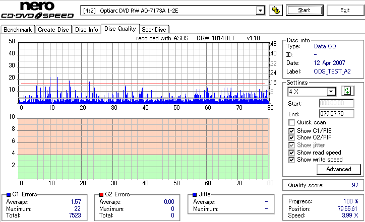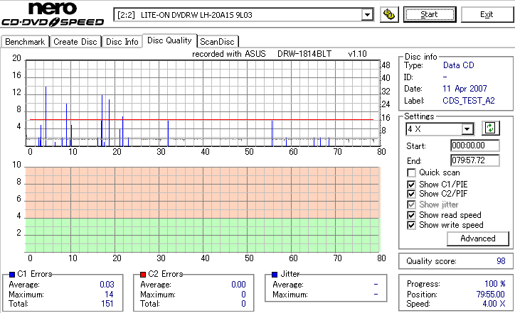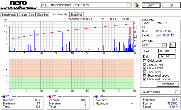DRW-1814BLTのCD-R焼き性能は特に注目すべき長所はなさそうです。 高速焼きはあまり安定せず(つっても高速焼きが安定するドライブなんて数えるほどしかありませんが) CLV最大速度となる16倍速焼きではとりあえずそこそこ程度に焼けます。 NECやPioneerのドライブと同レベルって言うと聞こえ悪いですが、最近のDVDドライブなんてプレクやLGを除いてこんなもんです。 |