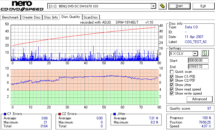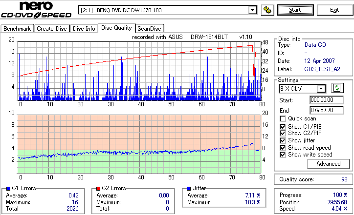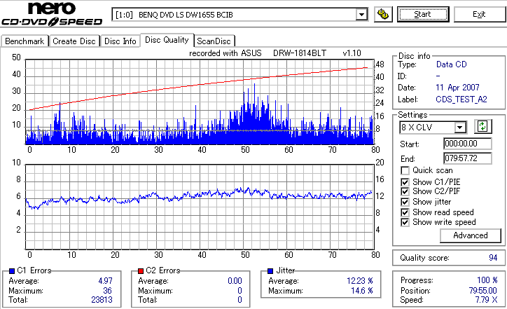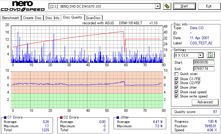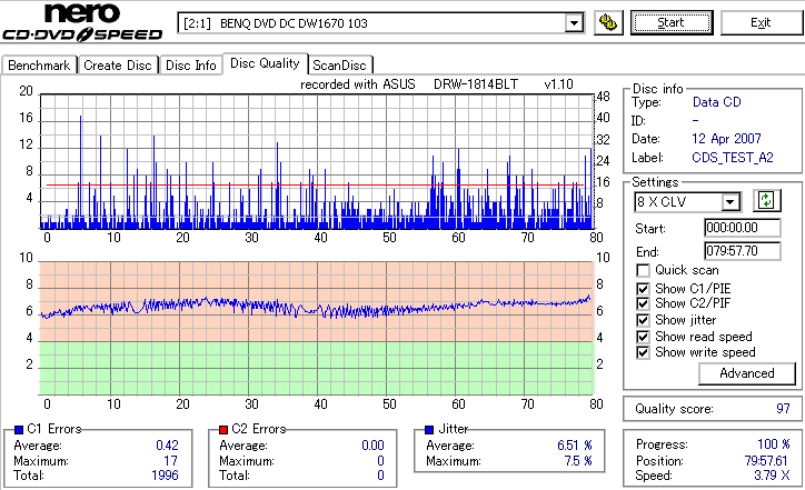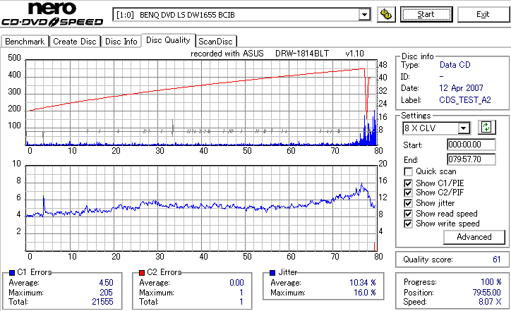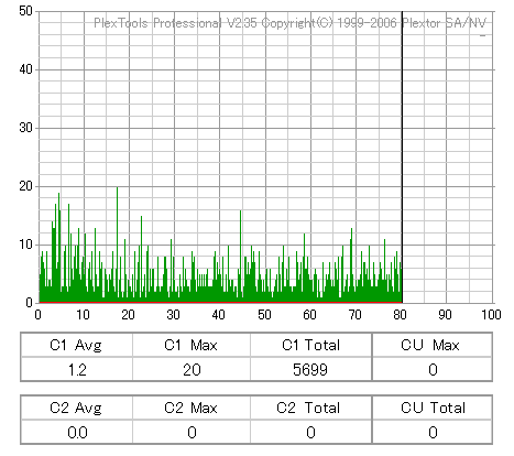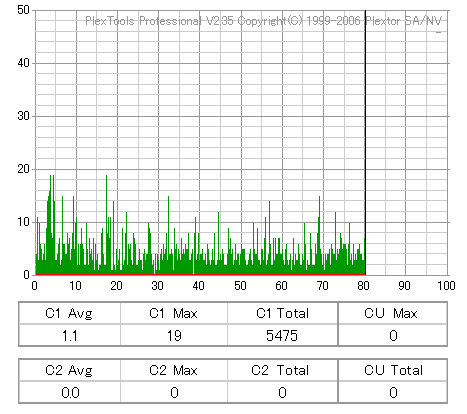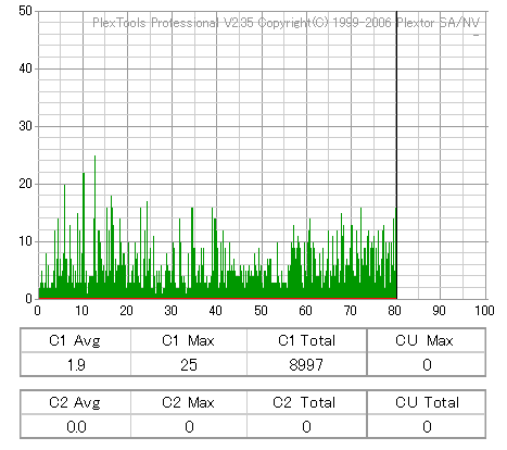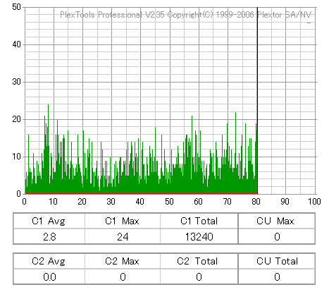 BenQのCD-Rは高速焼き時は早々に減速します。DW1670計測が減速直前にJitterが上昇してるのをしっかりと捉えています。 どのみち48倍焼きではJitterも全体的に高めになってしまうので、誘電並みの結果になる16倍で焼くのが良いでしょう。 |