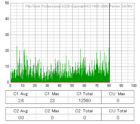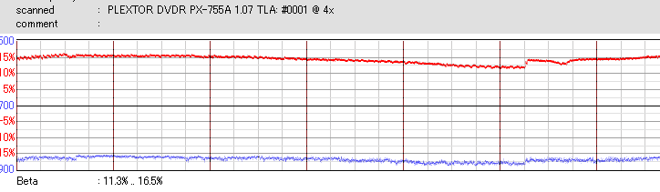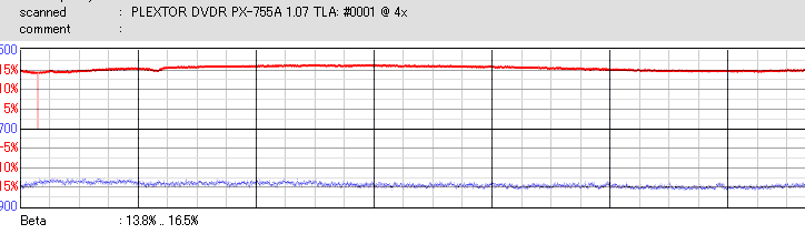 太陽誘電のCD-Rについては、最高速焼きではJitterが高めになってしまいます。16倍焼きではJitterも安定してきます。 あと、全体的にBeta高めの傾向がありますね。 |