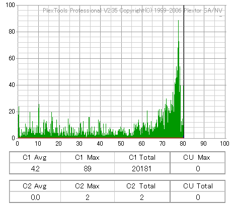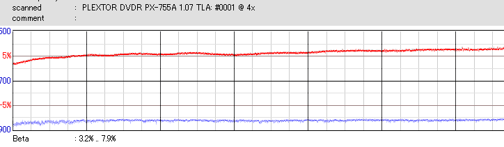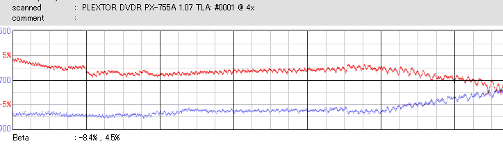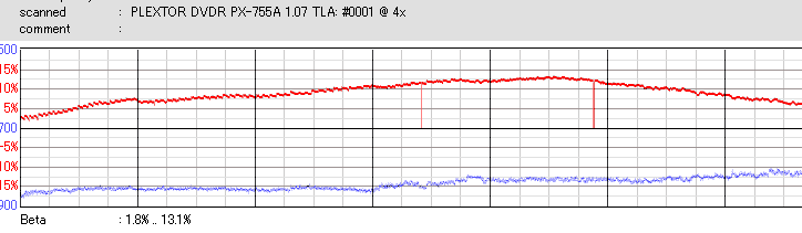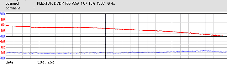 RiTEKのCD-Rは高速で焼くと外周が死にます。低速で焼いても外周のBetaが下がり気味になっており、ちょっと使うのを躊躇われる結果です。 |