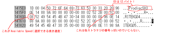 TEAC DV-W516Eのファームは12バイトのIDがあって、その1バイト手前に速度が16進数で記載されてます。