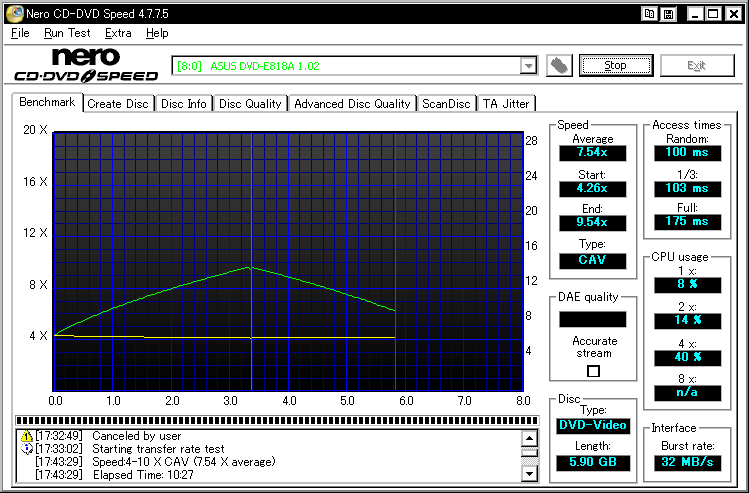 読み込み速度は3.2GB地点辺りでしっかり16倍速を超えており、16倍速ドライブと比較して25秒速い結果です。