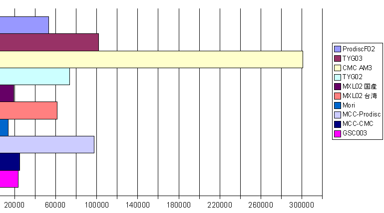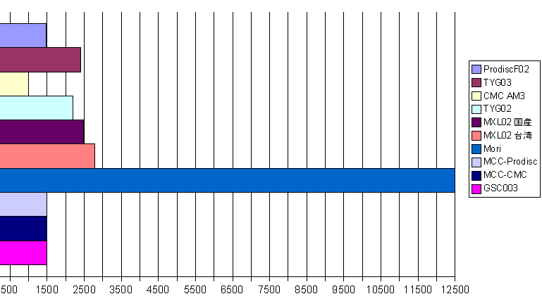 ![]() こちらは市場での最安値価格の比較表である。数値は50枚の価格だ。 森メディアが突き抜けているのが非常に目立つのだが、これは製品の特質上仕方の無いところだろう。 まず太陽誘電やマクセルのグループが2000円台にあり、続いて三菱を含む各種海外系のグループが1500円前後を占めている。 そこから更に下がって、CMC16倍が1000前後の位置にいるといった感じだ。 本来はこの1000円前後のグループにPrincoやOptodisc、Thaimedia等の廉価グループがひしめきあっているのだが、 今回の比較では信頼性の著しく低いと思われるそれらについての表記は除外した。 ・2007年7月現在 今、『買い』なメディアは? 現状メディアの価格ははっきりグループで分かれており、第1グループ(\2000〜)、第2グループ(\1500前後)、第3グループ(\1000前後)といった感じだ。 まずは第1グループであるmaxellと太陽誘電から選択する場合だが、これについては正直どちらでも問題ないだろう。 ただし、価格的な魅力が薄いためできれば台湾maxellという選択は無しの方向で考えたい。 PIEの低さを重視するか、PIFの低さを重視するかといった点での好みの問題になるかもしれない。 ただ、国産マクセルの方はすでに生産が縮小に向かっていることもあり、低価格での入手製が高いのは太陽誘電であると思われる。 信頼性を重視するのであれば、16倍速メディアからの選択はできれば避けたいところだ。 都心・電気街以外の地域では三菱化学メディアの製品は第1グループに分類される価格で販売されているが、 特にマクセルや太陽誘電に引けを取る品質ではないのでこれを選択しても良いだろう。 (但し、大量に購入するつもりならば通販等で購入した方が予算的に低く済むかもしれない) 続いて第2グループからだが、入手が可能ならばGigaStorageと三菱(CMC委託盤)の二択で良いのではないかと思われる。 但し三菱については最近開封前の委託先の判別が困難になっていたり、GigaStorageの8倍も入手が難しくなりつつあるといった点から、 どうしてもこれらの入手が難しい場合は他のメディアに流されることになる。 特にProdiscF02は地方の店舗等でもよく販売されており対応速度も高速なため、多くの人が手に取る機会を持つだろう。 ProdiscF02は悪いメディアではないが品質のばらつきがやや大きいため、使用にあたってはまず1枚試し焼きを行った方が良いだろう。 第3グループについてはロットや時期によるばらつきも多いため、比較リストで用いたCMC以外はここでは扱わない。 勿論本サイトでも使用者の助けになるよう率先してこれらのメディアの検証は行っていくつもりだが、その時点での品質と現在の品質がイコールでないこともしばしばある。 安いなり、それなりな品質であることが多いため、もしもこれらを使用するのであれば相応の知識と経験と勘と覚悟とその場のノリを持って挑んで頂きたい。 |