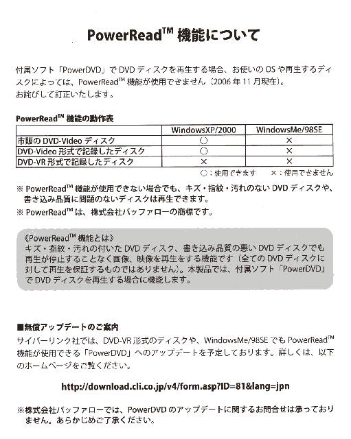 基本的な構造は似てはいるものの、チップの配置とかかなり変わっています。 どうやらただ単純に同じような構成でマイナーチェンジさせただけのドライブではなさそうです。 いつもより余計に分解(バラ)しております。(クリックでトレイを外した画像を表示) ![]() ピックアップ側からもスキャンしてみました。 比較対照がないので掲載してどうなるもんでもないですが。 眺めてニヤニヤしましょう。 PowerRead機能について このドライブ補足事項というか訂正の用紙が同梱されていまして、 ちょっと無視できない内容だったので念のため掲載しました。 どうもこのPowerRead機能とやら、2006年11月現在では98系のOSでは使用できない模様です。 旧環境やVRモードのディスクに使用する場合はパッチを当ててやる必要があります。 パッチのダウンロード先(http://download.cli.co.jp/v4/form.asp?ID=81&lang=jpn) ![]() |
