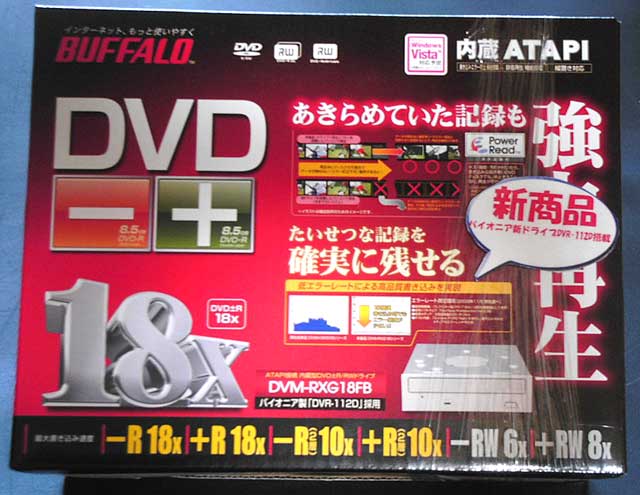 BUFFALOより発売の新製品DVM-RXG18FBです。 今回はちょっと特殊で、同社よりベーシックモデルのDVM-RXG18FB/Bが同時発売となっています。 ベーシックタイプは本ドライブから余分な添付ソフトを省いた廉価版で、市場での価格差は\500程度。 ただ、ブラックベゼルは廉価版にしかまだ存在しないようなので、それにつられる人もいるかも。 キズのあるDVDも不良部分を読み飛ばして再生するPowerRead機能を売りとしており、 またパッケージではWindows Vistaへの対応もアピールされています。 Features