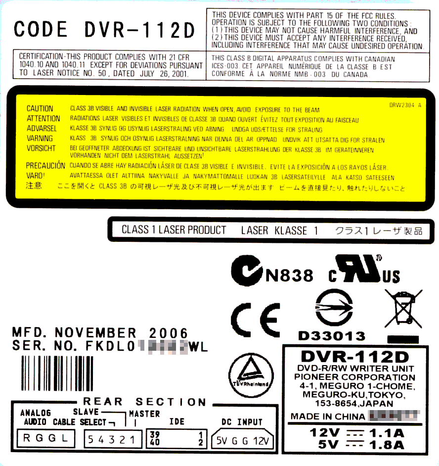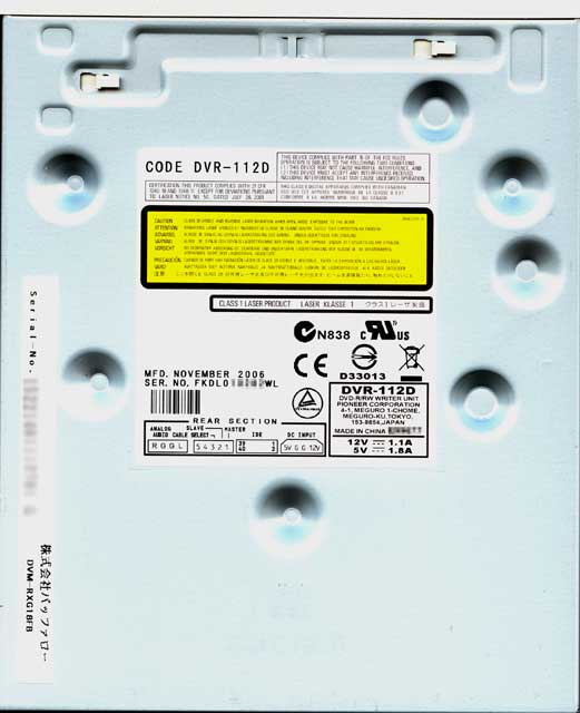 ![]() 外観はDVR-111とあまり変わりません。 ディスク共振スタビライザと称される天板の7つの窪みもそのままです。 天板とラベル画像(クリックでラベル部分を拡大します。) ![]() DVR-111Dバルク版とは異なり製造国表記はCHINAとなっており、 製造は2006年11月とかなり新しめです。 また、18倍速対応になったためか消費電力が上がっているのにも要注意。 基盤画像(クリックで基盤全体を拡大表示)