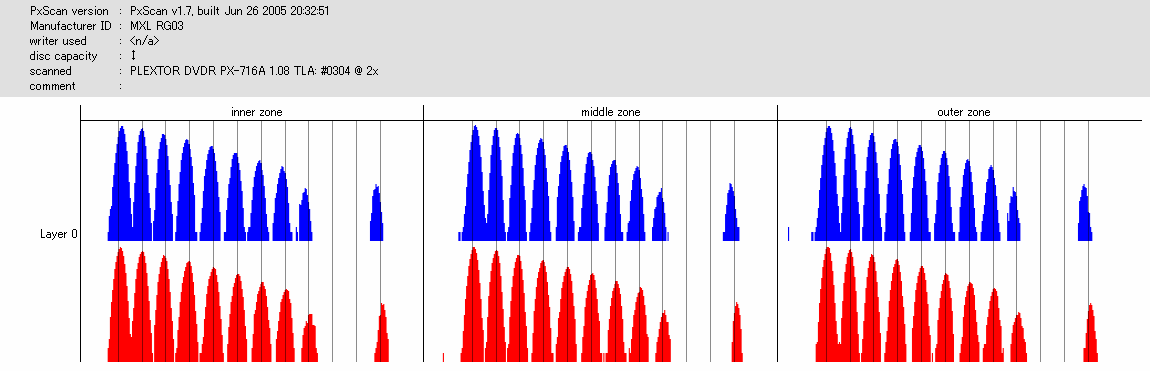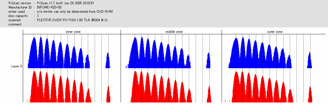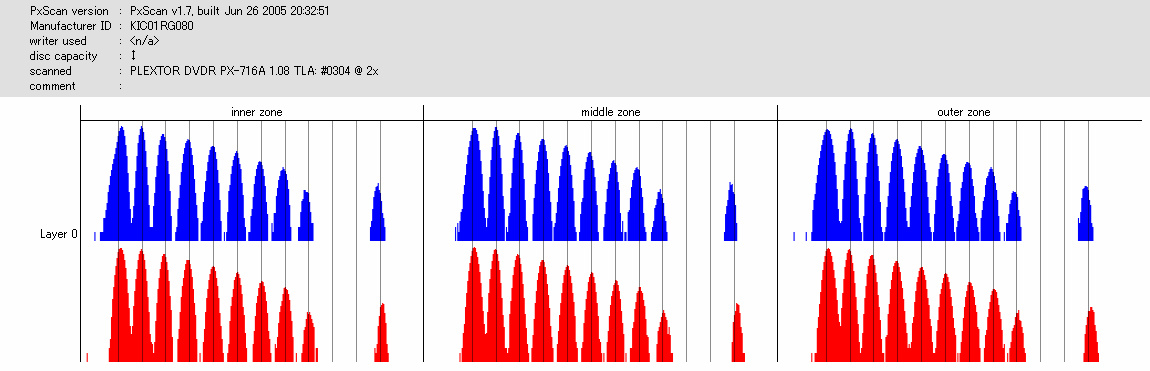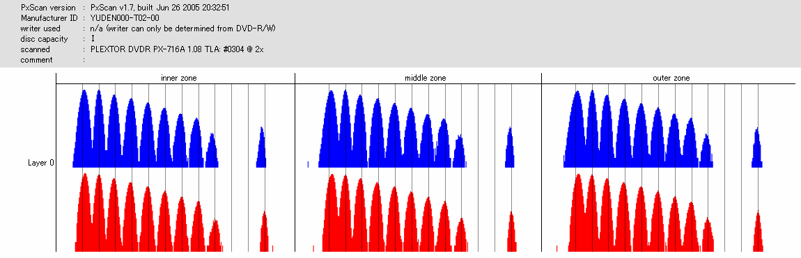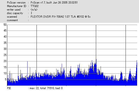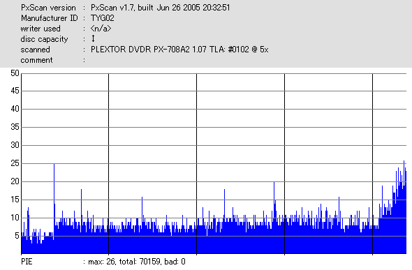文句ないんですが……実はこのディスク、高速(6x)で読み出すとPOF吐いてくれました。 708A2の結果でも外周膨らんでますし、若干の不安が残るところ。 |