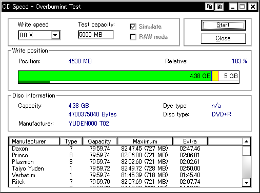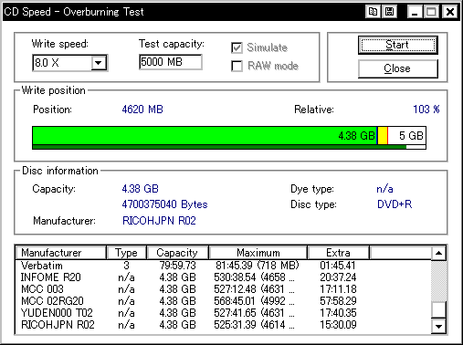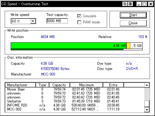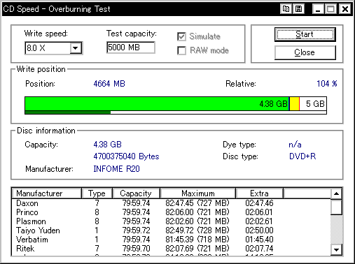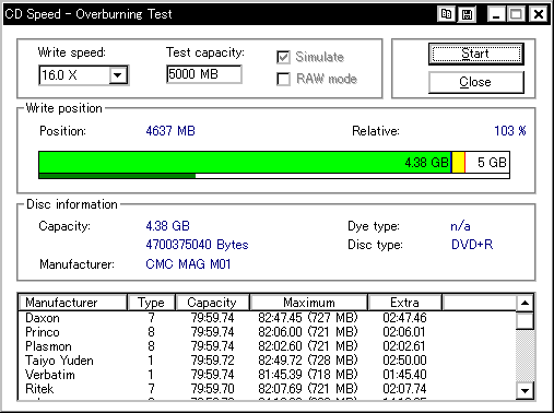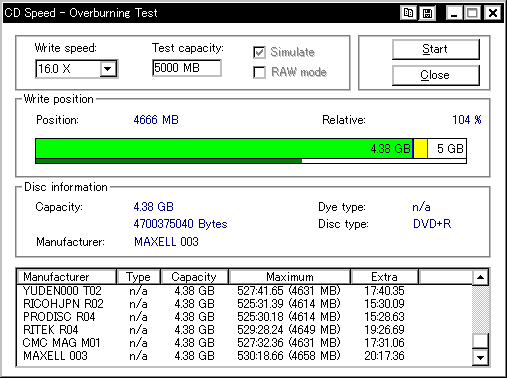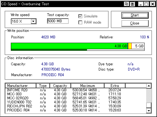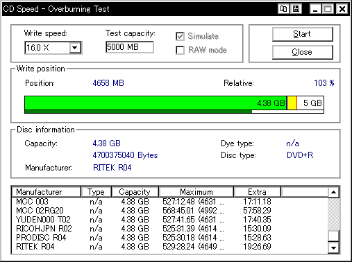 今までさんざん使ってて今ごろ知ったんですが、このDW1640というドライブ、どうもDVD+Rメディアのオーバーバーンに対応しているらしく、 InfomediaのDVD+Rディスクに対してオーバーバーンテストを行ったところ、4660MBくらいまでOK、との結果が返ってきました。 (通常DVD+Rの限界容量は約4482〜4484MB程度) ということで、今更ながら急遽DW1640を取り上げてオーバーバーン実験を行なってみたいと思います。 オババン。 |