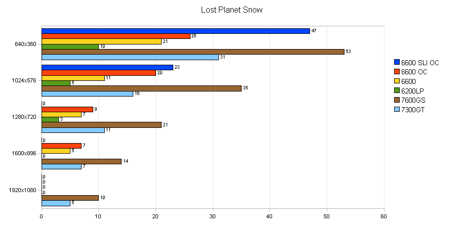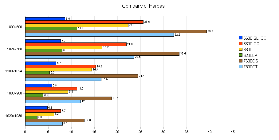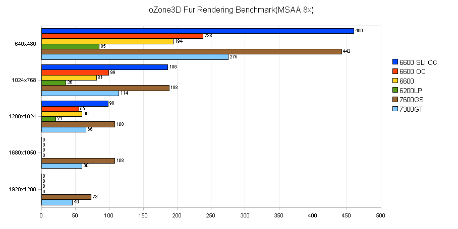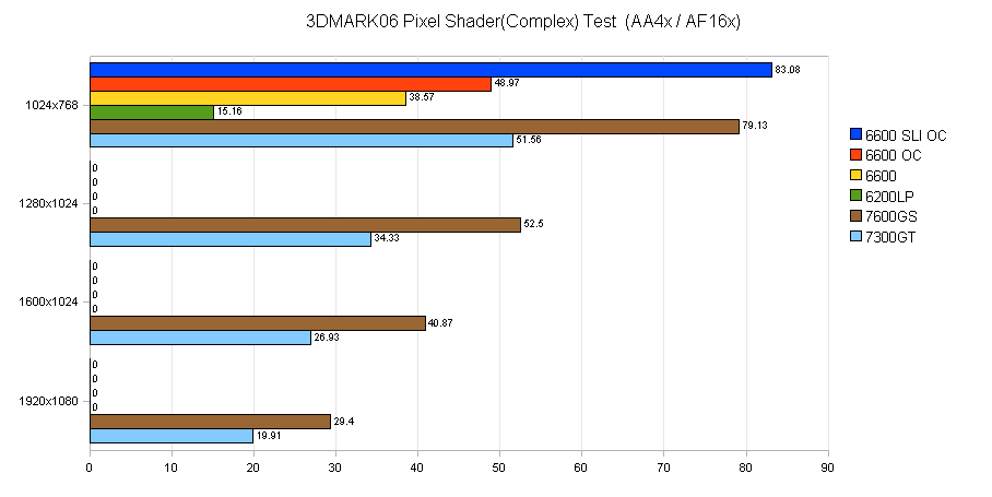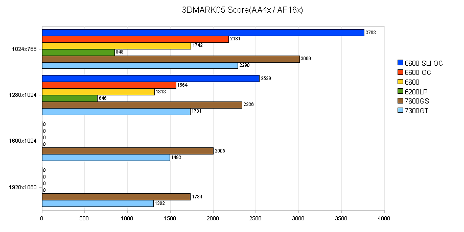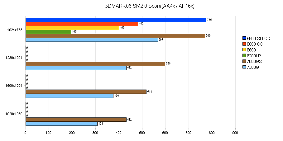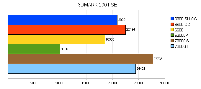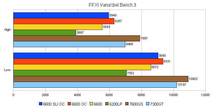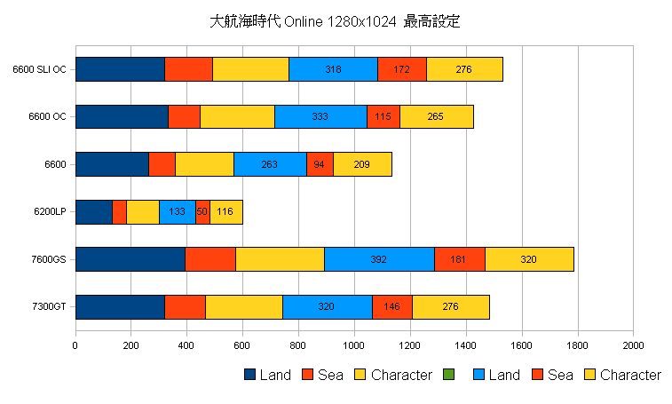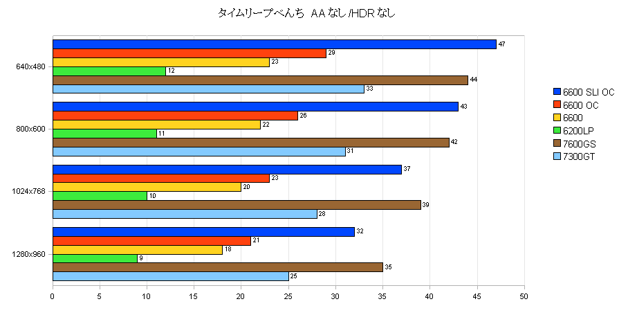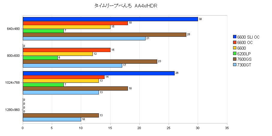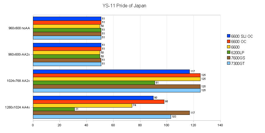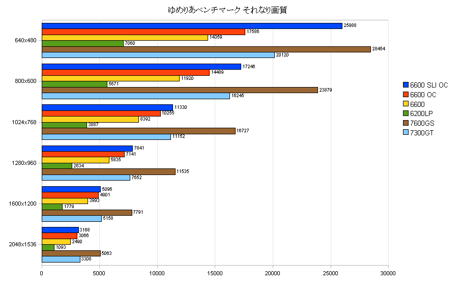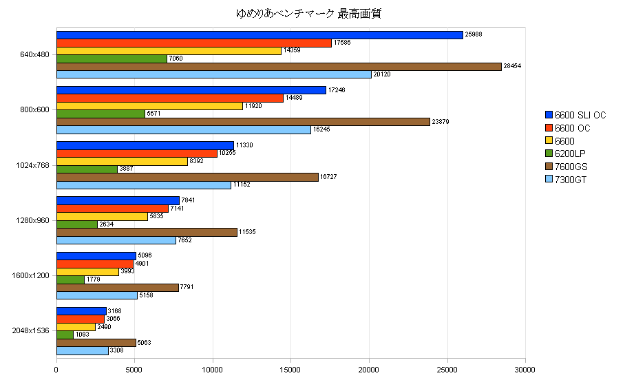 ※6200LPは64bitメモリインターフェイスの製造メーカー不詳のGeForce 6200(NV43)を使用してます。だいたい7100GSと同等の性能です。 ※7300GTは7600GSのピクセルパイプラインを無効化し、クロックを下げることで仮想的に再現しています。 ■3DMARK系ベンチマーク ![]() ![]() ![]() ![]() ![]() 3DMARK系では、6600無印のスコアはだいたい7600GSの半分程度になっています。限界までオーバークロックを行った場合3DMARK05と03では7300GTよりも高いパフォーマンスが出せるようですが、3DMARK06では残念ながら7300GTにも追いつく事はできませんでした。 2000円のビデオカードでSLIをできる環境を作ろうという気になる方がどれだけいるかは判りませんが、SLIの効果がうまく現れていない2001を除けばほぼ全てのベンチで6600 SLI OCの結果が後世代のミドルレンジカードである7600GSのスコアを超えており、これは評価するべき点だと思います。しかしながら、メモリ容量128MBというのが大きなネックになっているためか、3DMARK06の1920x1080解像度設定やAA/AF等重負荷条件設定時には、SLIやOCの有無に拘らずメモリ128MBの6600/6200は3DMARKが完走せず途中で必ず強制終了してしまうという問題が発生してしまいました。やはり高解像度で使用する際にはメモリ容量がネックになりそうです。 ■3DMARK06詳細 ![]() ![]() ![]() ![]() ![]() ![]() ![]() ■ゲーム系ベンチマーク1 ![]() ![]() ![]() ![]() ![]() ![]() ![]() じゃあ実ゲームではどうなんだっていう話なんですが、やはり最新タイトルではメモリ容量の差は大きいようで、Lost Planetでは1920x1080解像度で起動した際にはっきりと「メモリ容量が足りない」ような事を言われエラー終了してしまいました。一番効果が大きかったAquamarkでも結局7600GSと同等レベルにはなったものの、7600GSを超えるには至りませんでした。 ■ゲーム系ベンチマーク2 ![]() ![]() ![]() ![]() ![]() 割と軽めのゲームのベンチマークでは、SLIの効果がほとんど見られず、スコアは逆に低下してしまうことも。6600をオーバークロックする事での効果は結構体感できるレベルで出ているんですが、こちらも全て7300GTに届くには至っていません ■萌え系ベンチマーク ![]() ![]() ![]() ![]() タイムリープべんちでは軽負荷条件時にSLIの効果が大きく出ていました。しかし高解像度では7600GSに抜き去られたり、あとAA4x/HDR有効時には1280x1024がOKで800x600が駄目、しかもスコアが変という奇妙な挙動を見せたりと、いろいろと怪しい部分が多かったです。 ゆめりあベンチではSLI効果は一応あるものの実感できるのは低解像度のみで、高解像度ではあんまり意味ない感じでした。 ■OpenGL系ベンチマーク ![]() ![]() ![]() FurBenchではメモリ128MBのカードでMSAA8x設定+1680x1050以上の解像度でテストを行うと、MSAAが強制的に4xになって実行されてしまうためスコアは0としました。SLIの効果が最も大きく得られたベンチですが表示はスムーズとは言い難かったです。 ■結論 ピクセルパイプライン4本+64bitメモリとかいうオンボードビデオと殆ど変わらない程度の性能のGeForce 6200 ロープロファイル版や7100GSなんかと比べれば、2000円という価格で低設定ならゲームにも耐えられるレベルですから、旧世代カードとはいえ価格以上の効果はあると思います。このパフォーマンスならばおそらく現行のオンボードに負けることはないでしょうから(Radeon Xpress1250とかのオンボの中では頭一つ抜けてる奴にも多分負けはしないでしょう)、オンボードからの超低価格での乗り換えにはこの年末年始では最高の選択肢になると思われます。 パフォーマンス的には7300GSと7300GTの中間といったところの本ボード。とはいえ7300GTとの間には超えがたい壁があるようで、がんばってオーバークロックしても総合パフォーマンスで7300GTを超えるのは無理そうです。 じゃあSLIしたらどうなるのかっていう話ですが、これも対応アプリケーションならば7300GTを大きく上回ることはできそうですが、じゃあ7600GSに勝てるかというとこれは無理。SLI対応してないアプリケーションでは7300GTを下回ったり、下手すると本来の6600のスコアよりも落ちてしまったりもします。発熱や消費電力の面から考えても、こんなことするくらいなら普通に7600GS買ってシングルで使った方が良いんじゃないかと思います。これはSLI未体験の人が4000円の投資をして趣味でやるものです。 でもまあとりあえず、大航海時代とかFFXIとか三國無双だとか軽めのゲームはすらすら動くっぽいです。本当にちょっとしたゲームしかやらない人にとってはこいつで充分っていう気もします。 本テストに用いた各種ベンチマークソフトウェアのダウンロード先 3DMARK05 3DMARK06 http://www.futuremark.com/download/ Lost Planet 無料体験版 DX9版 http://jp.slizone.com/object/lostplanet_jp.html タイムリープぶーとべんち(元ネタが18禁ソフトメーカーらしいので閲覧の際は注意) http://xoops.frontwing.jp/product/timeleap/download.html ゆめりあベンチマーク http://www.yumeria.com/download/mark.html (ゆめりあベンチの解像度が640x480しか選べない件については2chの