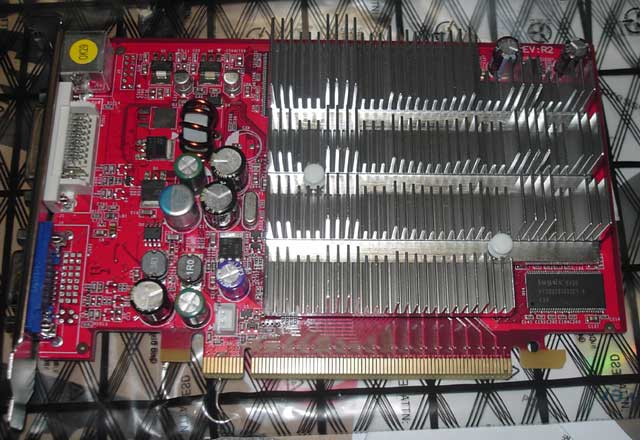 しかし、いくら当時のミドルレンジとはいえ現行のローエンドはコアの処理性能も上がってるし、値段が安い以外にいいことあるの? って疑問に思う方もいらっしゃると思いますが、おおありです。 型落ちとはいえミドルレンジ製品。要所要所でコスト削減のために機能削られてるローエンドカードと比べて「ユニット数が多い」「メモリ帯域も広い」等多くの利点があり、7300や7200よりは高速でしょう。8400GSとではユニット数やコア性能、クロックの差もありますのでさすがに苦しいと思いますが、このボードはファンレスでしかもオーバークロックもされていますし、価格を考慮するならば充分に魅力的です。 ![]() ボードレイアウトはこんな感じ。ファンレスで、出力端子はD-subとDVI、それとS端子。 メモリはhynix製のものが採用されています。 ![]() ヒートシンクは凹凸のあるデザインで、やや隣のスロットにはみ出すため2スロット占有です。 コンデンサは日ケミやニチコンのものが多く使われてますが、Capxonのものが2個、SACONのものが1個だけ混じってました。 付属品はマニュアルとドライバCD-ROMのみ。 DVI -> D-sub変換コネクタやらTV出力ケーブルやらといった便利なものは全くもって付属しません。 更に言うと箱の中に緩衝用のスポンジすら入ってません。帯電防止袋に包まれたビデオカードがそのままポンと入ってます。まあこれはありえない低価格の分削ったと思えば仕方のない所。 ■オーバークロック、SLIでパフォーマンス限界に挑戦 本来GeForce6600の定格コアクロックは300MHz、このボードは350MHzと既にOCされているモデルなわけですが、ここでは敢えてパフォーマンスという面で限界を探るため、オーバークロックを行い常用可能な限界状態でベンチマークを行います。そのため、まずはどこまで耐性があるのかを調べないといけません。