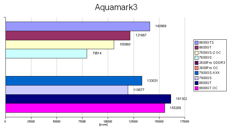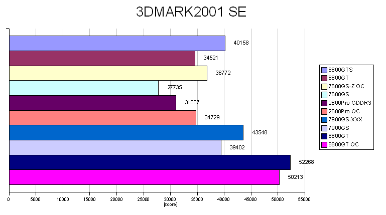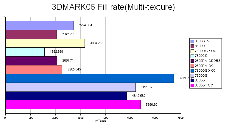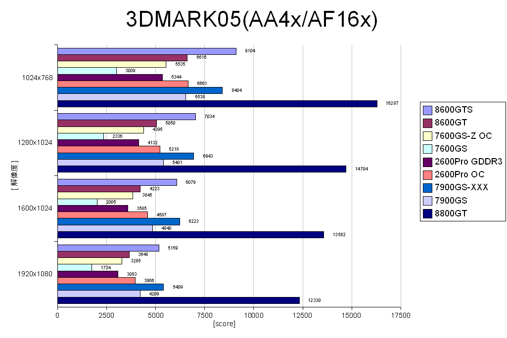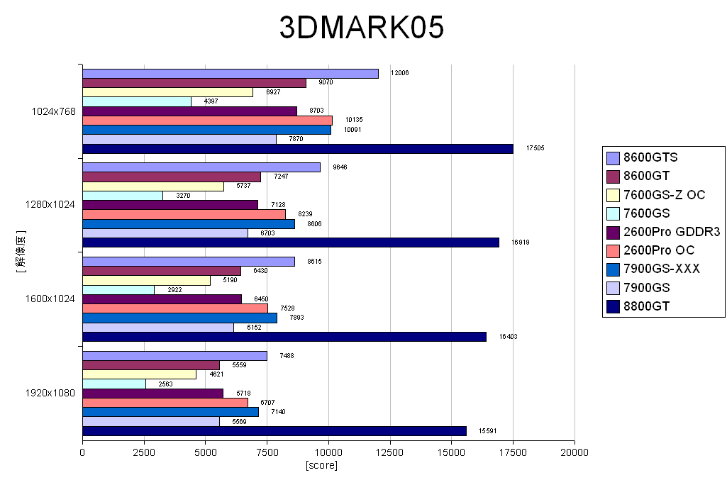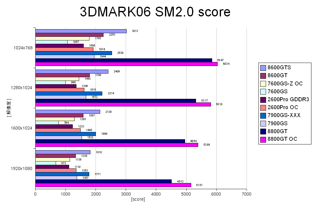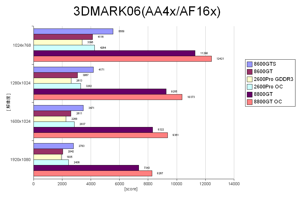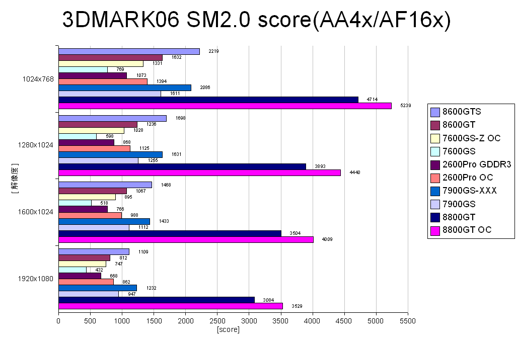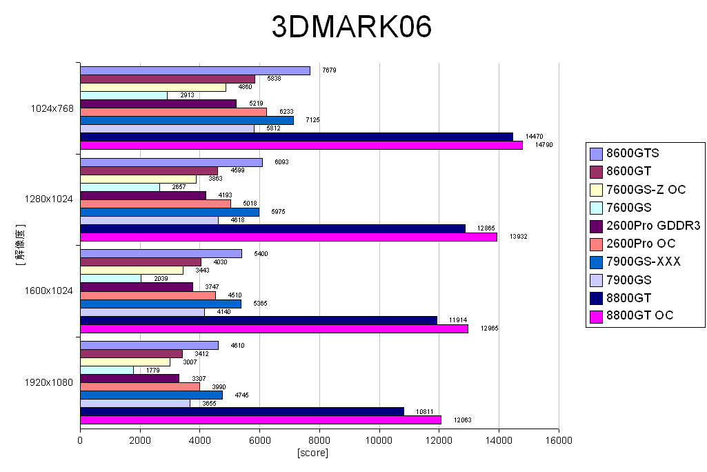 8600GTは3DMARK05においては異方性フィルタリング(AF)やアンチエイリアス(AA)の設定に拘らず7600GS、GS-Zよりも優勢なようですが、反面旧世代のベンチマークにおいては逆転される場面も出てきています。 Radeon HD2600PROの結果は特徴的で、3DMARK05においてデフォルトの設定においてはOCの有無に拘らず7600GS-Zに差をつけていますが、AA/AFをかけた途端OC版は8600GTに迫られ、非OCについては7600GS-Zよりもスコアが低くなってしまっています。 3DMARK05においてはだいたい8600GTS>=7900GS-XXX>7900GS>8600GT≒2600PRO GDDR3、その他においてはだいたい7900GS XXX>8600GTS>7900GS>2600PRO-OC≒8600GTという図式が成り立ちそうです。 ■3DMARK06