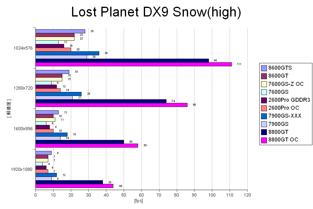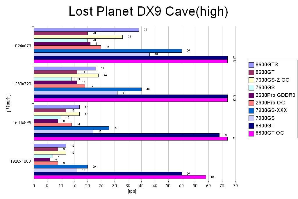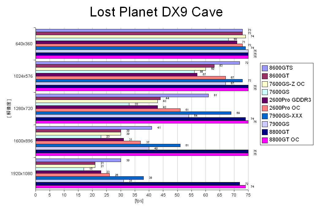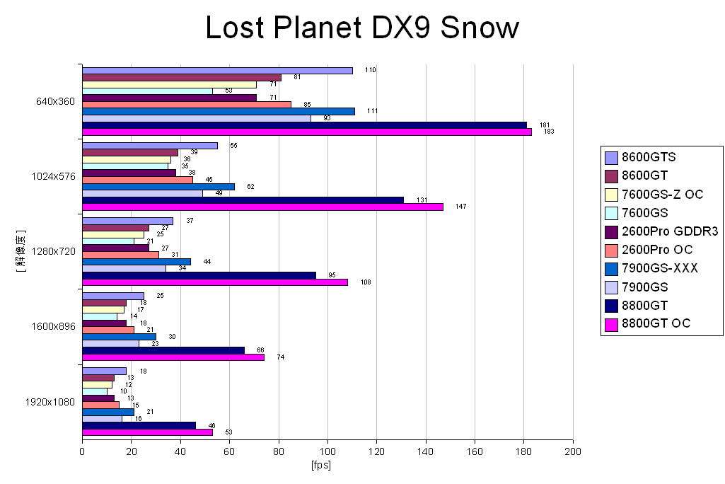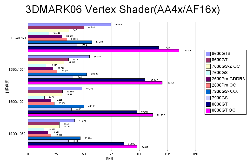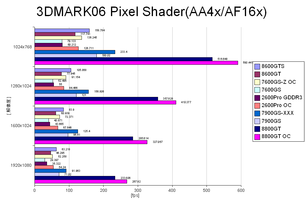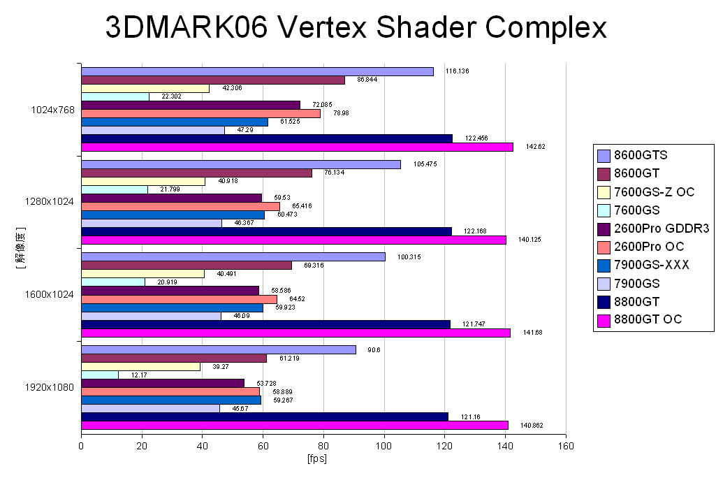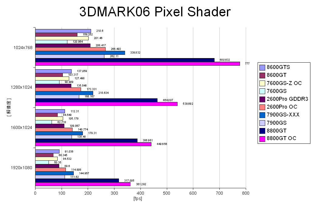 3DMARK06についてはAA/AFを動作させるとGeForce7ファミリーはSM3.0/HDRテストが動作しないため、総合スコアが非掲載となっています。3DMARK06だけでなく、他のベンチマークソフトにおいてもGeForce7シリーズはAA 4xまでしか選択できないのに対し8シリーズは16xまで選択できたりと、アンチエイリアス処理に関しては現行カードの方に利があるようです。 標準設定での総合スコアでは多くの解像度において8600GTS>7900GS XXX>2600PRO OC≒7900GS>8600GT>2600PRO>7600GS-Zの並びとなっていますが、一部高解像度条件にて8600GTSが7900GS-XXXに逆転を許す場面も見られます。2600PRO-OCはスペック的にはだいたい2600XT GDDR3版と同等程度なので、2600XTを参列させたとしたら8600GTS以下8600GT以上の位置に入ると思います。 各テストを細かく見ていくと、SM2.0のテストにおいてはGeForceファミリーは順当に8シリーズが7シリーズを上回っていますが、ここでも高解像度では7900GS-XXXと8600GTSの逆転現象が。反面Radeon HDはいまいちスコアがふるわず、2600PROは8600GTはおろか7600GS-Zを下回ってしまっています。しかしRadeon HDは解像度が大きくなった場合のスコアの落ち込みがGeForceよりも小さいようで、解像度が上がるにつれてスコアが有利になっていき、Full-HD解像度においては2600PRO-OCと8600GTのスコアが逆転しているのは興味深い点です。 Pixel shaderテストは旧世代の7シリーズの結果がかなり健闘しており、全体を通して7600GS-Zが8600GTを上回り標準設定においては8600GTSに迫る結果、7900GS-XXXに至っては完全に独走状態となっています。Radeonはこのテストにおいては更に大きなアドバンテージを見せ、2600PRO-OCが8600GTSやノーマル7900GSすらもを押さえ込み、OCなし版も8600GTSと並ぶ健闘を見せています。しかしAA/AF設定を行ってテストした途端Radeon群のスコアが大きく落ち込み、OC版2600PROは7600GS-Z以下まで、OCなし版に至っては通常の7600GSと同程度までfpsが下がってしまいました。しかしここでもRadeonの解像度の優位性が若干出ており、2600PRO-OCはFullHD解像度において7600GS-Zを逆転しています。 Vertex shaderテストは8600シリーズの圧倒的優位となっており、Radeon HD2600PROがそれにやや離れて追従する形となっています。しかしAA/AF設定を行った場合このアドバンテージは小さくなり、アーキテクチャの設計上7シリーズより得意なはずのこのテストでも7900GS-XXXに逆転を許してしまっています。RadeonはAA/AFかけるとスコアが一気に7600GS-Z以下まで落ちてしまいます。ここで地味に目を引くのが7600GS-Zの結果で、AA/AF設定や解像度の設定による変化が他モデルと比べてかなり小さく、設定によっては8600GTとfpsが逆転する場面も見られています。この辺りの挙動はGeForce8シリーズやRadeonHDシリーズと違い、シェーダユニットが固定となっているためかもしれません。 メモリフィルレートに関してはメモリバンドの広い7900GSの完全独走状態となっています。7600シリーズとバンドが同じ8600GTSは、7600GS-Zにすらスコアで抜かれてしまっています。 ■ゲーム系ベンチマーク1