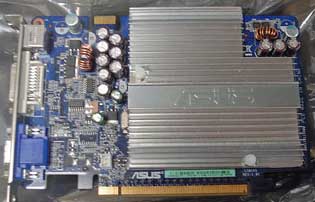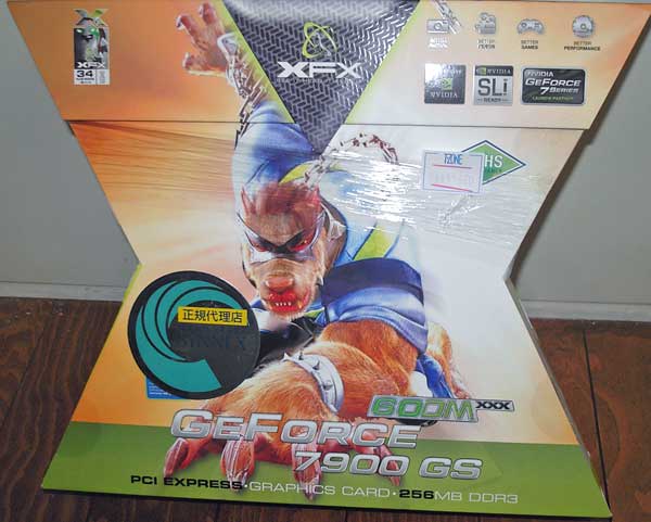 上の表を見てもらえれば判るかと思いますが、7600GS-Zはコアクロックこそ7600GTに届きませんが、搭載メモリが本来800MHz(1600MHz)での動作に対応したもので、手動でオーバークロックを行うことにより(理論的には)どの個体もほぼ確実にメモリクロックが800MHz以上で動作する仕様になってます。 ■ASUS EN7600GS SILENT/HTD/256M (購入価格8500円程度) ![]() OC版の76GS-Zは7600GTとほぼ同等もしくはそれ以上のパフォーマンスを持っているため、定格7600GSのサンプルとしてASUSTekのファンレス版もテストしました。ボード後ろまでせり出したよく冷える巨大なヒートシンク、1スロット低消費電力設計、付属ソフトとバランスが取れており、splendedやASUSのブランドイメージもあってたぶんGeForce 7600GSの中では日本で一番売れたモデルじゃないでしょうか。 ![]() 接続端子はDVI-D、D-Sub、TV-Outの3種類です。 ■XFX PV-T71P-UDD7(GeForce 7900GS XXX 600M) (購入価格12000円程度) ![]() 7900GSは上位機種の中でもコストパフォーマンスが良く、オーバークロック耐性もあって7600GTの上を狙うユーザーに非常に人気を博したモデルです。ニーズがあればそれに応えるメーカーも多く、オーバークロックモデルも数多くリリースされています。その中でもGalaxyのGeForce7シリーズ末期にリリースされたGF 7900GS-SPHと並んで最高位のクロックアップを施されているのがこのモデルで、パッケージの600M XXXの表記が光っています。 ※GeForce7ファミリー ハイエンドビデオカードスペック比較表