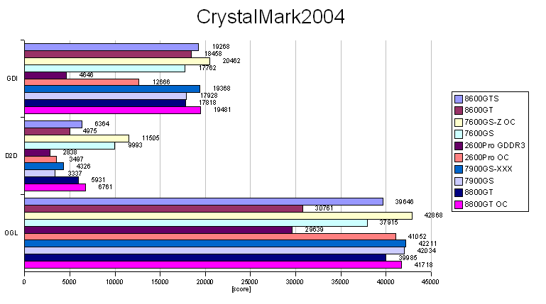 3DMARKのPixel shaderテストともまた違う傾向ではあるんですが、AAをかけるとやはり今までの傾向と同じく若干優位性は失われるものの全体を通してRadeon優位という結果になりました。さすがに7900GSは高いスコアを出しているようですが、AAかけるとGeForce7シリーズのスコアは完全に失速してしまいます。 CrystalMarkのテストでは全体的に旧世代の7600GSやGS-Zが優位になっています。ただ、7900GTXを使ってもOGLのスコアは43000程度だったり、逆に旧世代の6800Ultraで100000近いスコアが出たりするベンチでもあったりしますので、あくまで参考程度にとどめておくのが良い値かもしれません。 ■結論! ベンチマークスコアを見ていただければ一目でお判り頂けたかと思いますが、8800GTのスコアが他をぶち抜いて圧倒的です。下位モデルの8600GTSよりも倍以上のスペックを持った化け物カードです。専用レポートの方を読んで頂けたならばお判りかとは思いますが、現行のリファレンスモデルは放熱に問題があるものの、ビデオカードとしては2007年一番のヒット製品と言われており、パフォーマンスは\30000という価格を差し引いてもすばらしいものがあります。 Full-HD解像度での3Dゲームにも十二分に耐えられるものですので、ビデオも見たい、ゲームもしたいという方にとっては現状ではかなり良い選択肢だと思います。 各種ベンチマークの結果において、例外はありますが8600GTSは多くの場面においても7600GS-Zを上回っていますので、とりあえずはGeForce 7600GTを比較対象として考えるのはやりすぎでしょうね。7900GSと比べても多くの場面で上回るようなのですが、高負荷条件化においてはかなりの頻度で8600GTSと7900GSの逆転現象が発生してしまうようでした。性能的には現状では7900GSとだいたい同等もしくは若干上程度の製品として考えて良いかと思いますが、高解像度・高付加環境での使用や、メモリフィルレートにパフォーマンスが大きく左右されるアプリケーションを使用する場合等は7900GSに若干劣る場面も見られるかもしれません。しかし最近は8600GTSの価格もかなり下がってきていますので、これから8800GTの256MB版が発売されて更に価格帯が下がってくるようであれば8600GTSも選択肢として十分にアリだと思います。 但し、これがGalaxyとかのOC版との比較となると話は別で、元クロックが低くマージンが大きいためオーバークロックを行った際のスコアの上がり幅のインパクトは7900GSが上になると思います。ですのでOC常用をデフォルトとして考えている人にとっては8600GTSはやや魅力の薄い製品じゃないでしょうか。7900GSもごく少数市場に残っている在庫が捨て値で裁かれることがたまにあるようですので、そういう人たちは並んででも79GSを、もしくはもっとステップアップして7950GTとか79GTX辺りを狙った方が良いかもしれません。 8600GTについては7600GS-Zを上回る場面もありましたがその逆の場面も結構見られ、オーバークロックしたGalaxyの7600GS-Zに対し優位に立っているかと言われると正直微妙です。まあこれについてはそれに比較対象がOC版っていうのがいけないという話もありますが。あとは8600GTSをダウンクロックしただけなので純粋に8600GTとは呼べず、いろんな所のベンチ結果を見てると8600GTはうちのテストよりも若干高いスコアが出てる所が多いので、恐らく純正8600GTと7600GTとを比べた場合は8600GTがやや優位に立てるんじゃないかと思います。価格も7600GTより若干高い程度ですし、6600GTとかからの買い替えならパフォーマンスは十分だと思います。ただ7600GTからだと体感できる性能差はあまりないと思うので、既に7600GTや7600GSのOC版を持ってる人にとってはちょっと微妙な気がします。 Radeon HD2600PROについてはどう言ったらいいのやら・・・・・・低負荷設定のゲームでは結構良いスコア出してたり、解像度によるスコアの落ち方が全体的にGeForceより小さかったりと特徴はあるんですが、どうにもアプリケーションによってパフォーマンスにムラが大きい気がします。この辺り、「これはこっちより性能良いぞ」っていう感じでシンプルに評価し難い部分があるので、ちょっと選択が難しい所です。とりあえずGDDR3版については少なくとも7600GSよりはパフォーマンス高いとは思うんですが、ものによってはその優位性がほんの少ししかなかったりなので、DDR2版では下手すると7600GS下回る事もあるんじゃないかという気がします。 クレバリーオリジナルの2600PROについてはそれなりにオーバークロックもできてとりあえず7600GSに差をつける程度のパフォーマンスも得られましたし、HDCP対応、HDMI端子つきのビデオカードでUVDという付加価値を考えるとOC前提で使用するならば価格対効果は上々だと思いました。思ったとおりクーラーは静かで結構冷えますし。今までGeForce一辺倒で通してきた私ですが、この結果ならサブマシンの7600GSを2600PROに入れ替えても良いかなと思いました。 蛇足ですが、リテールクーラーは全体的に1スロットで結構うるさいのが
