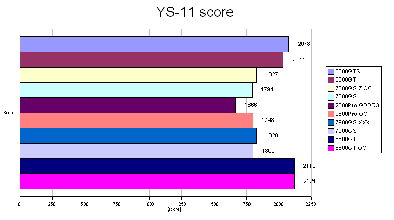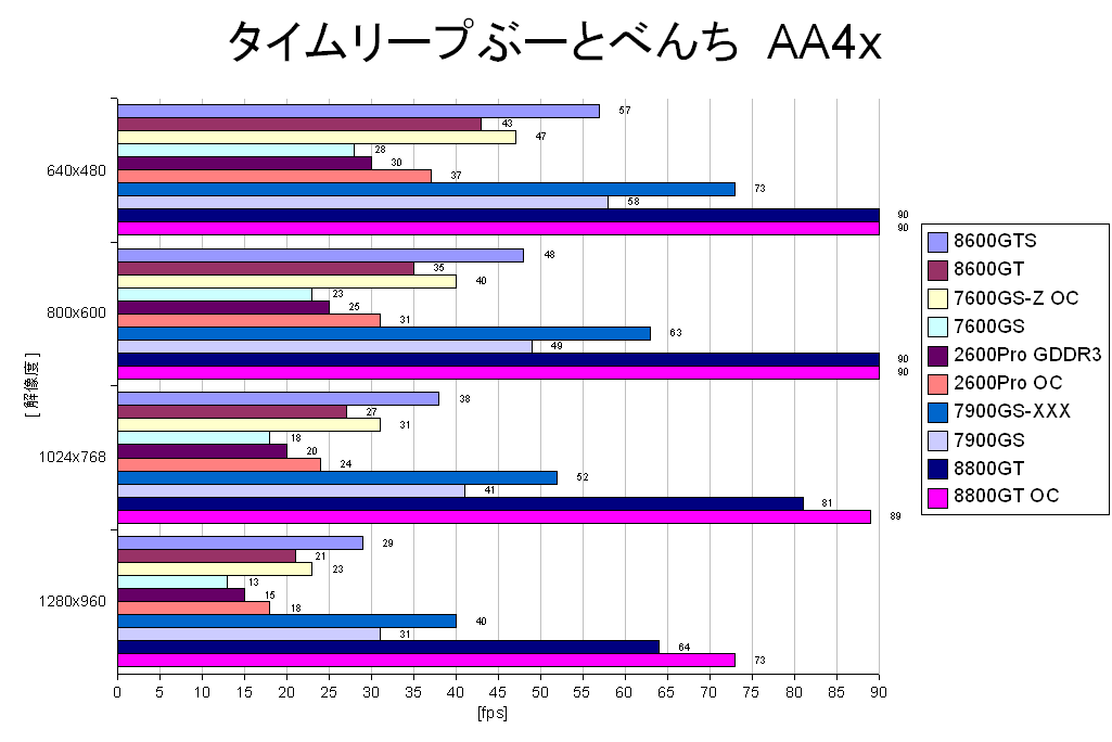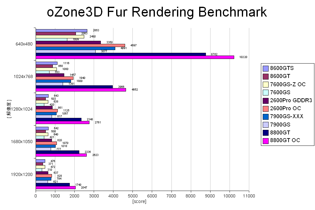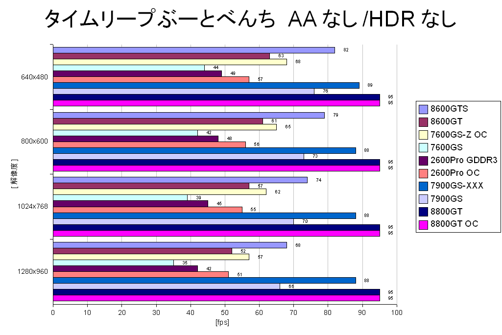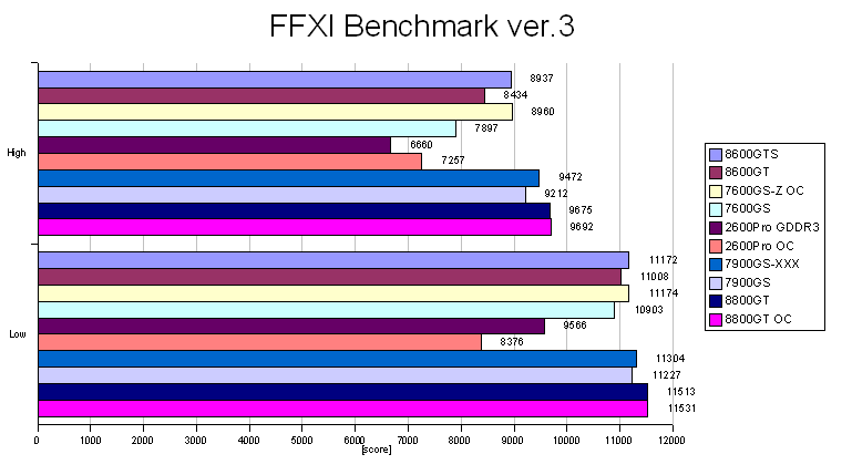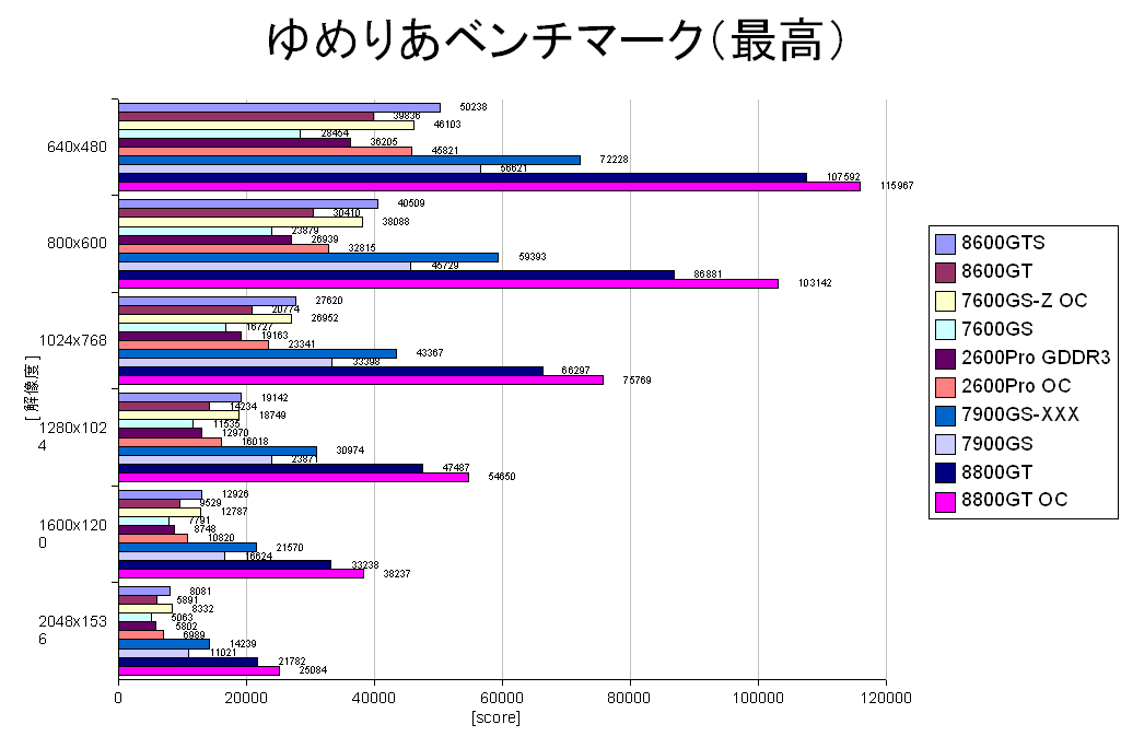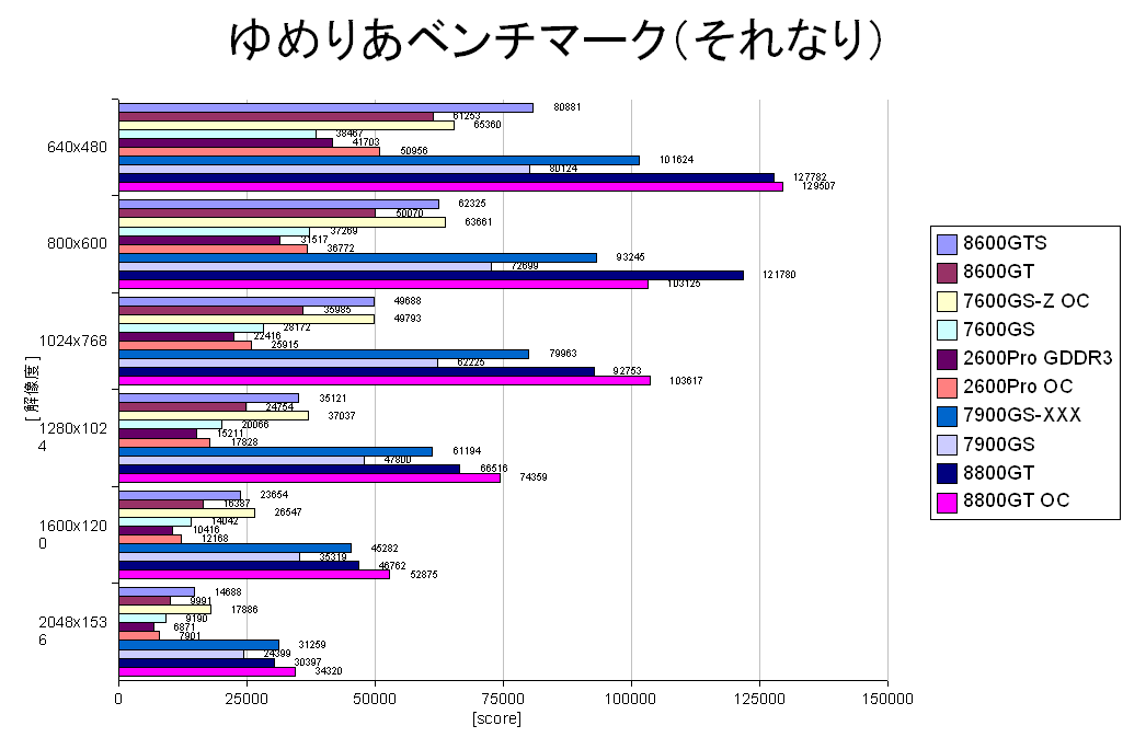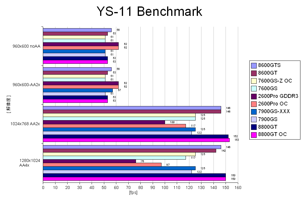 タイムリープぶーとべんちについては標準設定はAA及びHDR以外の全てのオプションON、エフェクト紙ふぶき、服装デフォルト。高設定はそれにAA4xとHDRを加えた設定で行っています。標準設定・高設定共にSM2.0のエフェクト負荷をかける設定になっているためか、完全にGeForce優位な結果ですね。あと7600GS-Zが8600GTを完全に上回っていたり、メモリバンド幅が違う7900GSを抜きにすればGeForceシリーズの中ではほとんど動作クロック順適な並びになっています。そしてやはりここでも8600GTSと7900GSの高負荷逆転現象は起こってしまっています。 それにしてもこのベンチマークソフト……エロゲの癖に1280x960の最高画質設定で快適といえるフレームレートでプレイするにはGeForce 7950GTないし7900GTX程度の性能が必要になるって話ですか?そんな阿呆な・・・ ゆめりあベンチマークはリリース当時は萌えベンチに属するイロモノと思われていましたが、意外にもベンチマークソフトとしての性能が評価され国内では定番化してますね。3D性能を計る上で優秀かというと一概にそうとは言えない気がするんですが、ベンチマークソフトの中では実行時間がかなり短くて手軽なのと、VGA意外のPC性能にほとんどスコアが引っ張られないので純粋にビデオカードの性能が評価できるので使いやすいんですね。 このベンチマークについては画質最高設定でこそ何とか8600GTSが面目躍如というかぎりぎりのラインで7600GS-Zに対する優位を守っていますが、その差はほとんど誤差程度のごく僅か、しかも画質それなり設定のSVGA以上では完全に7600GS-Zに敗北してしまいます。このベンチマークにおいてはフィルレートの高い7600GS-Z(たぶん7600GTも)がかなり有利であると言えると思います。 というか8600GTSのスコアがふるってないだけで、GeForce7900GSのスコアはぶっちぎってます。ゆめりあベンチはメモリフィルレートが大きく影響してくるベンチマークソフトらしいので、このベンチマークを基準にしてしまうと現行のミドルレンジビデオカードの印象はかなり悪くなってしまうと思います。 面白いのがRadeonHDで、どういうわけか描画負荷に結構な差があるはずの最高設定とそれなり設定のスコアにほとんど差が出ていません。(そして、WindowsXP環境下においては髪の毛の描画がバグってしまうという現象が・・・)このためそれなり設定での結果は7600GS以下というかなり印象悪い結果に・・・。最高設定においてはOC版とOC無が8600GTを挟み込む形で、それなりに順当な位置になっていると思います。 YS-11ベンチはあまり負荷の高くないベンチマークですが、ここでは8600シリーズが優位となっています。Radeonはここでも特徴的な結果を見せており、ウィンドウモードでの結果が(AA有でも)GeForceより高いのに、いざフルスクリーンモードになると7600GSノーマルにさえ完全に逆転されてしまいます。 FFXIベンチマークは旧世代もいいとこですしCPU依存率も高くベンチ結果もほとんど頭打ちになってるのであまり参考にならない気がしますが、それでもまだFFXIベンチの結果を重視する方は結構いるようなので一応スコアは取ってみました。こちらでもRadeonHDのスコアが奮っていないというか、OC版がOC無し版よりも下のスコアになってしまうというありえない事が起きていたりします。 どのカードでもFFXIをプレイする上で必要十分以上の性能は出ていますし、ベンチ中にストレスを感じそうなコマ落ちなども全く起こっていませんので、自分でやっといて何ですがFFXIのベンチ結果については気にしない方向で。 ■OpenGL系