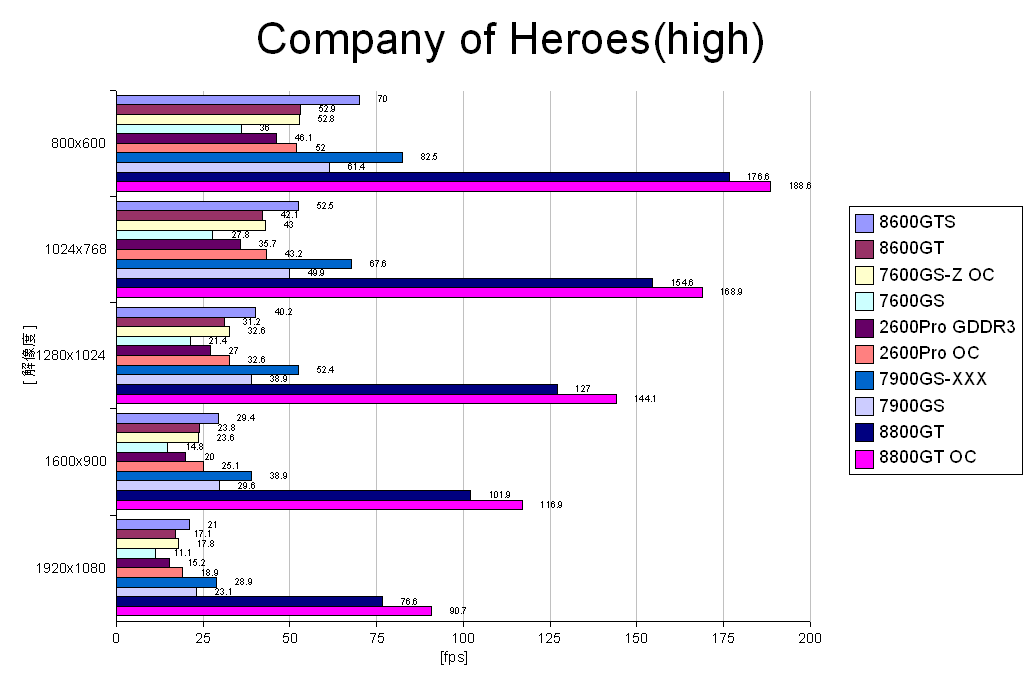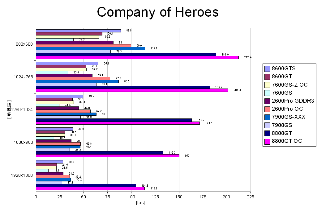 ロストプラネットのスコアについては、標準設定では現行の8シリーズやRadeon HDが旧世代ビデオカードよりも優位となっており、さすがに7900GS-XXXには僅かに及ばないもののミドルレンジカードである8600GTSがノーマル版7900GSを完全に抑え込んでいるのが特徴的です。しかしこれがhigh設定となると話は変わってきて、8600GTSは7900GSに及ばなくなりRadeonシリーズは7600GS-Z以下のスコアまで後退してしまいます。 Company of HeroesではRadeon HD2600PRO-OCがGeForce8600GTSを突き放すという現象が起こっており、高解像度においてはOCなしの2600PROも8600GTSを上回っています。しかし描画負荷の高くなるHigh設定においては優位性が失われてしまっており、OC有でも8600GTと同等程度になってしまっています。ここでも8600GTSはノーマル版の7900GSに勝っていますが、高解像度・高負荷条件となるとやはり逆転されてしまうようです。 Aquamarkは無料版の標準設定で計測を行っているものですが、だいたい3DMARKと同じような並びになるようです。過去に所持してたビデオカードのベンチ結果はFX5600が25000、6600無印が40000、6600GTが75000弱、7600GTが100000程度と、だいたいnVidiaの公称するランク順と並ぶ感じです。 既に過去のベンチマークソフトですが、7900GTX程度の性能ならばまだフレームレートが頭打ちにならずに(200〜300fpsとかまで上がる)超高速で終了するので、最近のカードでもそれなりにスコアが取れるベンチマークですね。 Radeonシリーズのスコアが掲載されていませんが、これはベンチマークは最後まで走るものの最後のスコア表示画面が出ずにプログラムが強制終了してしまうためです。fpsはそれなりに出ていたので、スコアが出ていたとしたらそんなに悪くないと思います。 各ソフトの設定は以下の通りです。標準設定はノーマル7600GSで自動設定にしたもの、高設定は同じく7600GSで設定できる最高の設定にしたものです。