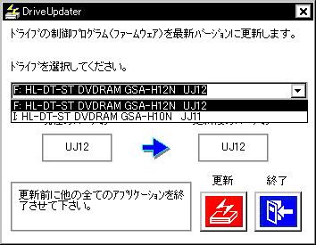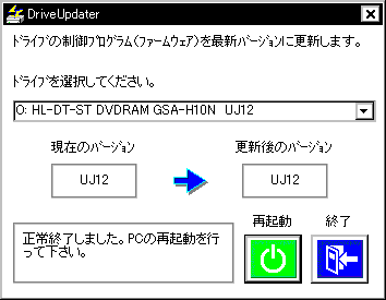 つい先日BuffaloのHPより公開された、HLDS製GSA-H12N用のファームウェアJJ12ですが、 YSS様のCD-R実験室の情報よりGSA-H10NとH12Nは採用チップが同じであるとの事で、 CDFreaks等ではCrossFlashへの期待が沸き立ちました。 そこへ新ファームのUJ12が投下。あっという間にCrossFlash用のファームが作られてしまいました。 以下のページでは、私もそのファームを頂いてGSA-H10NをH12N化してみようと思います。 一応、書いておかなければいけないこと。
