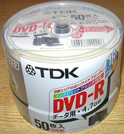 ![]() TDK DVD-R 16x (TYG03 - made in Japan) まずはこいつがいなくちゃ始まらない。 TDKブランドで販売されている誘電の16倍メディアです。 |