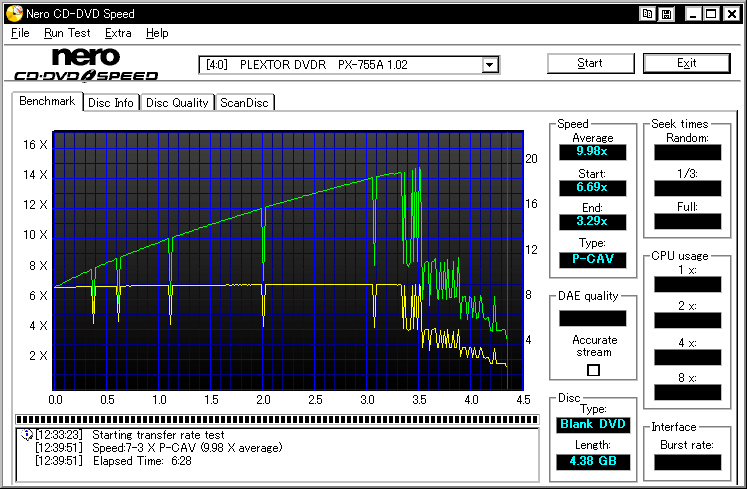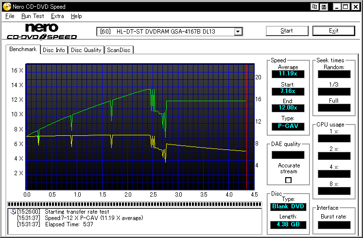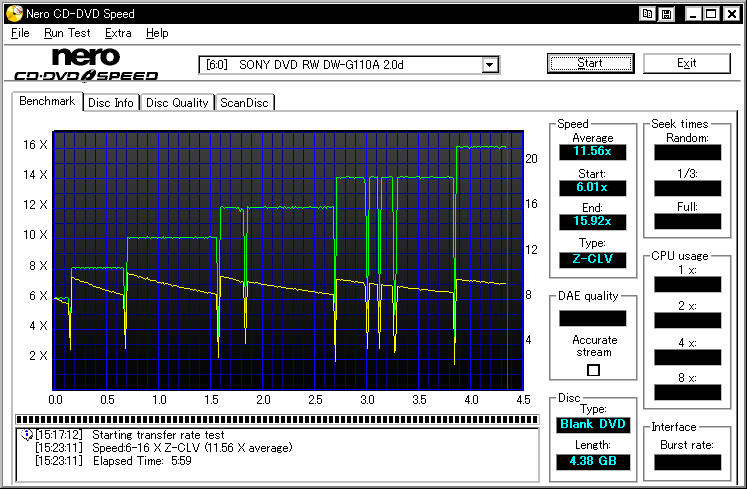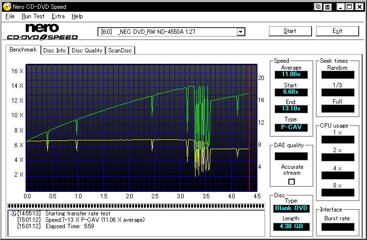 Transfer Rate Testにて書き込み時の転送速度を予測してみます。![]() ![]() 13倍を超えた辺りで減速し、後は以上の通り。 ![]() ![]() 外周でちょっと怪しい挙動を見せますが、最後まで上がり切ってくれました。 ![]() ![]() 終盤がかなり辛そうな感じですが、一応16xまで上がってます。 ![]() ![]() 13倍で頭打ちです。 ![]() 接続するとトレーの開閉が一切できなくなってしまい、使えません。 ![]() ![]() これも16倍まで上がってくれました。 ![]() ![]() 14倍には届かず、12倍で停止となりました。 ![]() ![]() これも14倍あたりでひっかかり、結局12x CAVの動作に移行。 ![]() ![]() 15倍くらいまでは出てくれましたが、そこで減速してしまいました。 ![]() ![]() 14倍地点で減速してしまいます。 ![]() ドライブが異音を出し、ブランクディスクを一切認識してくれませんでした。 ![]() なんかドライブがシステム上に変な名前で認識されてしまい、動きません。 というわけで、読みのときとはまた違った結果となりました。 実際に焼いてみたらまた違った挙動を取るのでしょうが、それはまた次の実験にて。 |