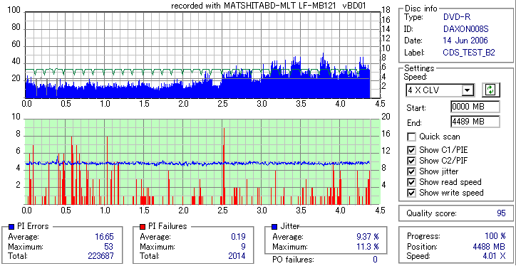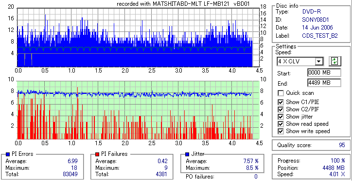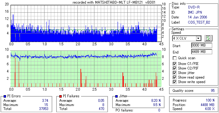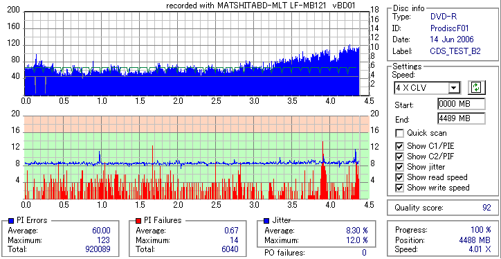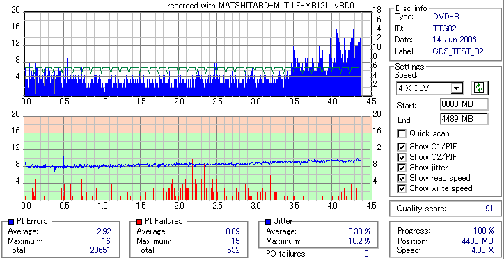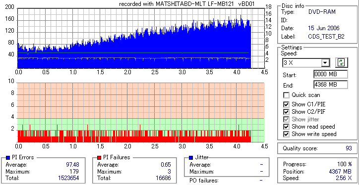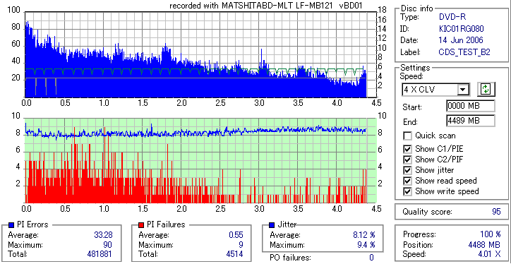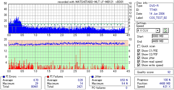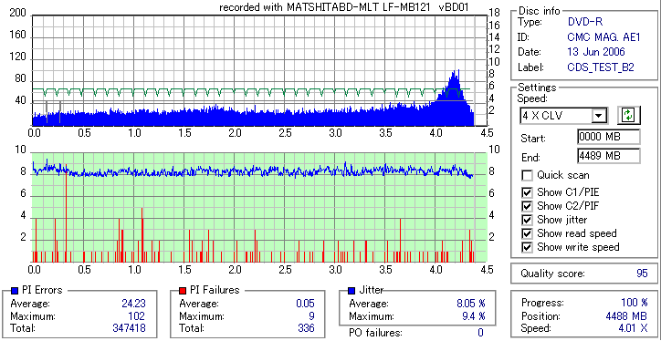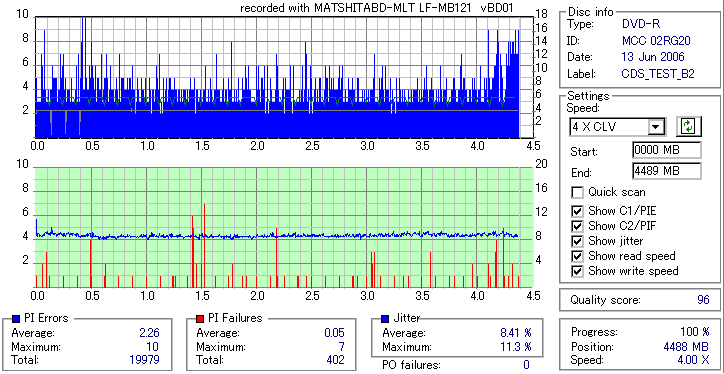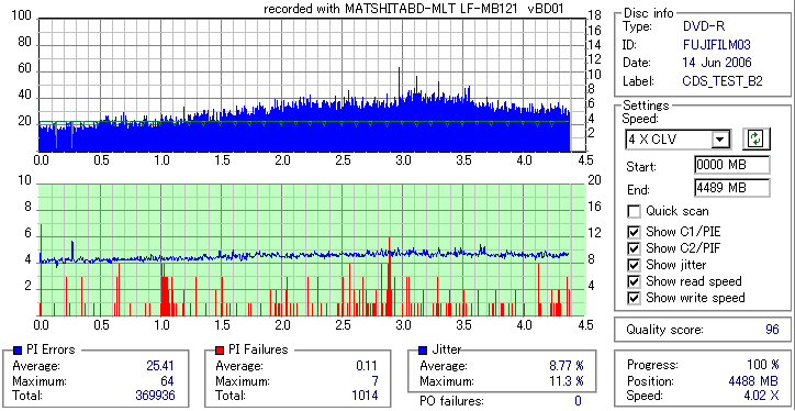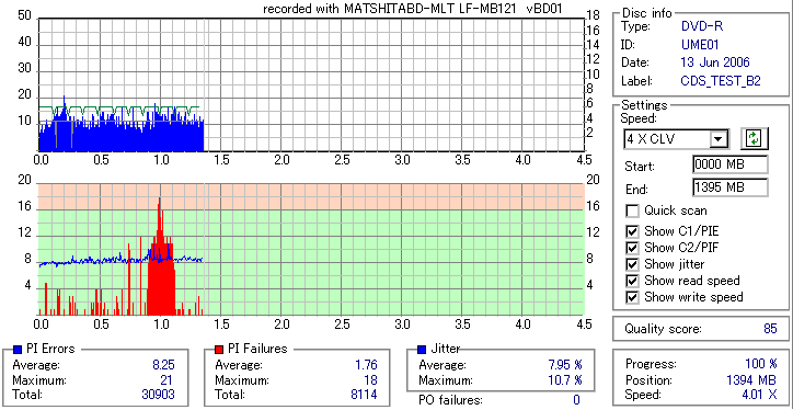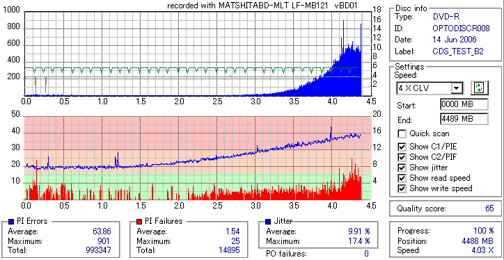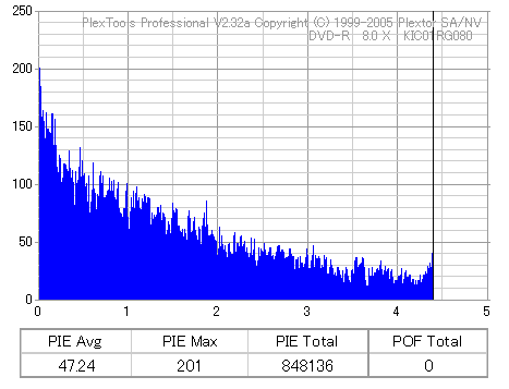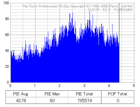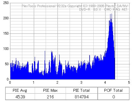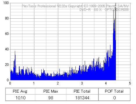 Choice DVD-R 8x <CMC MAG.AE1> 選択可能な速度:[4x-6x-8x] ![]() ![]() ![]() 外周跳ねてますが、これも一応問題なし。 |