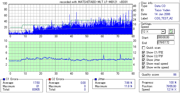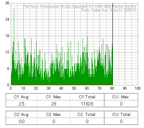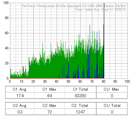 SONY CD-R 48x @ 24倍速記録 <太陽誘電製> 選択可能な速度:[8x-12x-16x-24x] ![]() ![]() ![]() 16倍速領域からJitterが乱れ始め、24倍速の領域ではC2エラーが多発しており、かなり厳しい感じがします。 |