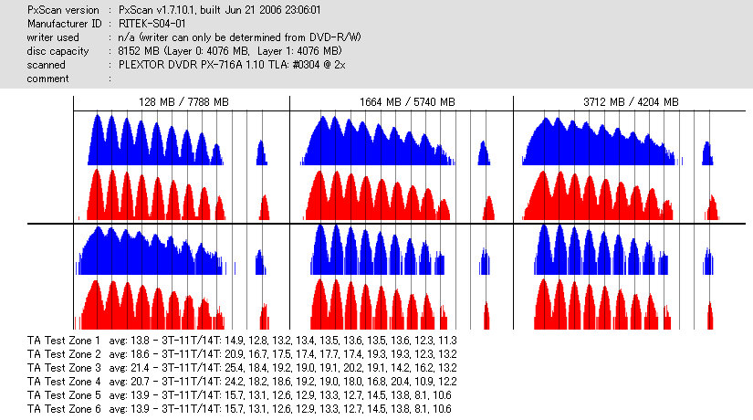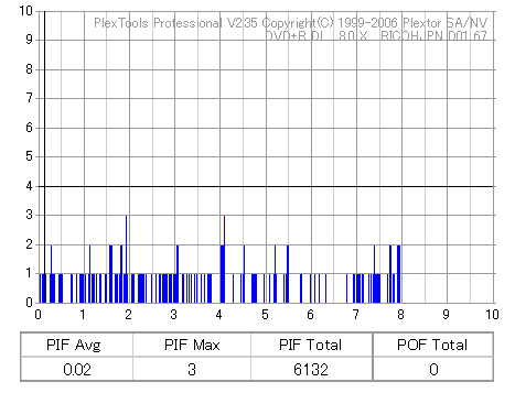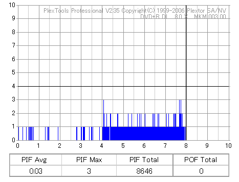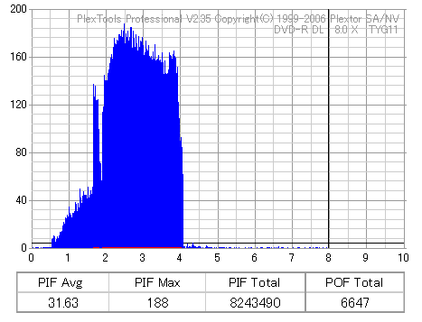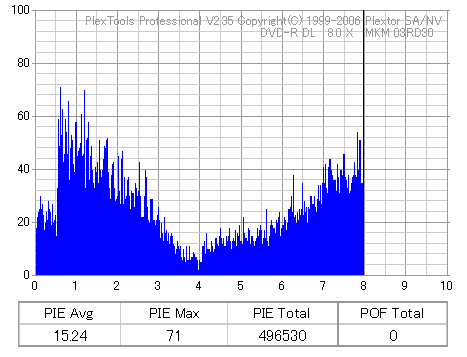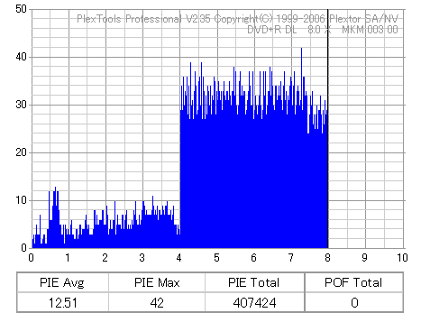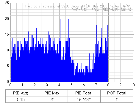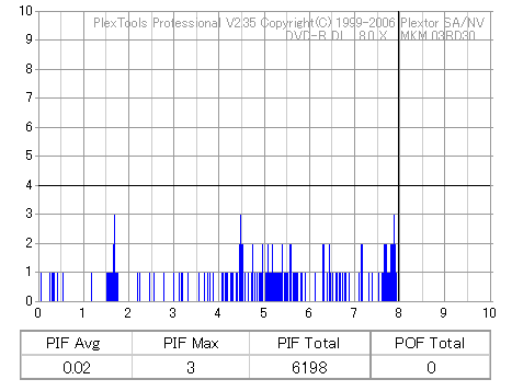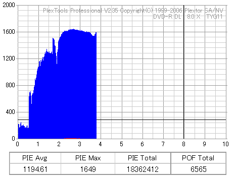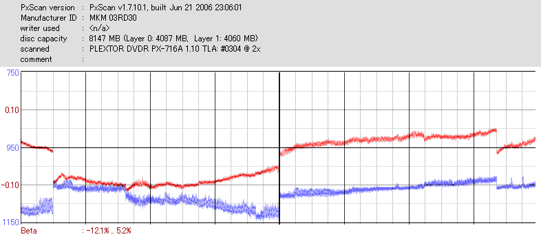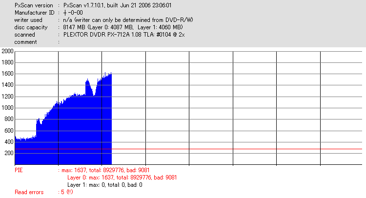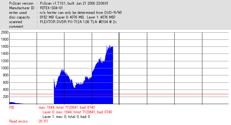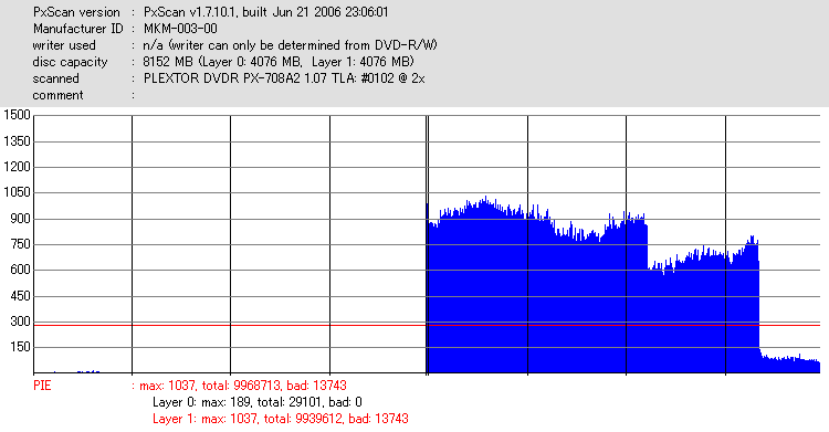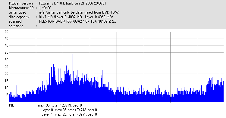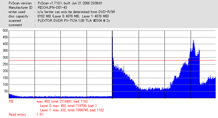 まあまあ良好な結果だと思いますが、PX-712Aの結果がものすごいことになってます。 ・・・っていうか、そもそもうちの712Aは2層の読みに全然適してないっぽい感じなので(ちょっとでもJitterが高いとすぐエラーが跳ね上がる)2層の検証時にはあんまり真剣にエラー値を参考にしない方が良いかもしれません。 |