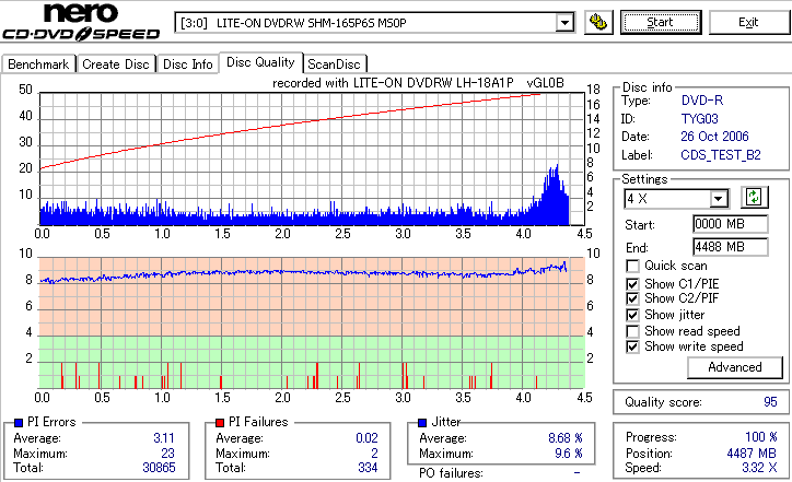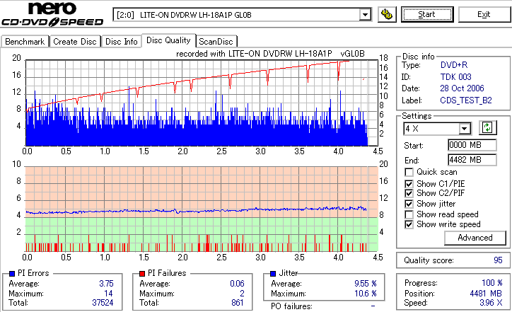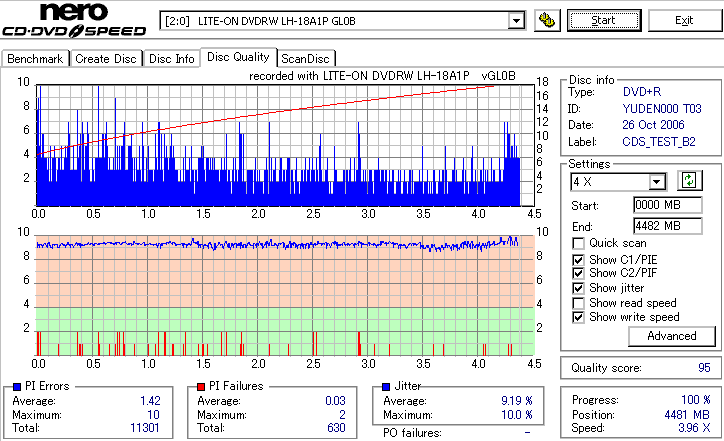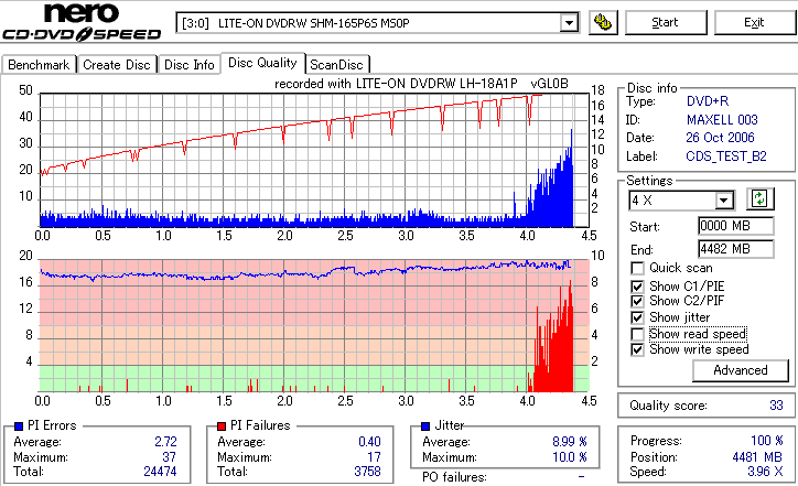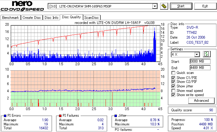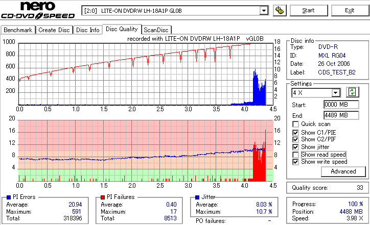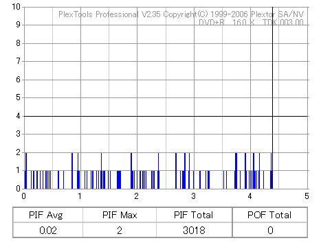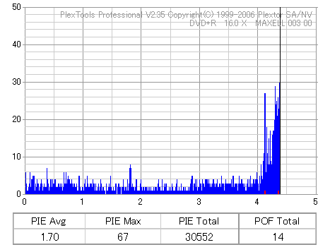 まず始めにやる事っていったらほかにもありそうなものを、いきなり18倍速速度違反焼きを検証です。 LH-18A1Pは通用太陽誘電の16倍速DVD±Rメディアへしか18倍速書き込みが許可されていないのですが、 SmartburnのOverSpeed機能を使用することで、ほとんどのメディアに18倍速書き込みができるようになります。 それを使って、管理人が所持している全ての16倍速メディアで18倍速記録を試してみました。 とりあえず、まずは国産群から。 結果から言うと、どうもAZO系メディアへの速度違反焼きは芳しくありません。 シアニン系等AZO以外の色素を採用したメディアなら外周が膨らむもののそこそこの結果になるようです。 故に、maxellと三菱で18倍焼きは鬼門です。日本では入手性が低いですが、TDKやSONY、RICOH等のメディアならばなんとか18倍速記録にも耐えられそうな感じです。 |