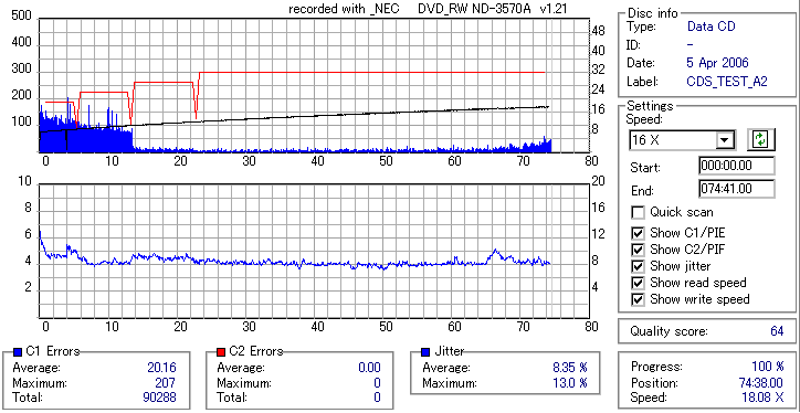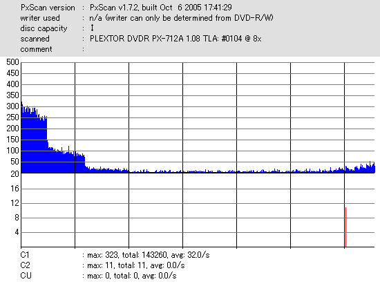 内周にエラーが固まり、外周にはC2。どうやら高速CD-RWはかなり辛そうです。