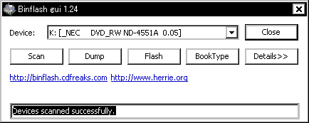 そこで、BinFlash guiを使用し、ND-4551A用のファームをflashします。