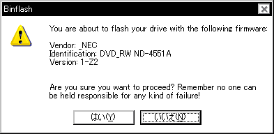 Flashボタンを押してND-4551A用のファーム(BIN)を選択すると以下のメッセージが出ます。