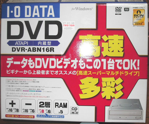 IO-DATAより発売のND-4550A採用機種。 パッケージ版だというのにいきなり\9000割れの価格で登場。 -RAM対応のNEC機種ということで、非常に期待をかけられている方も多いのではないでしょうか。 添付ソフトはUlead DVD-MovieWriter4とB's Recorder Gold8 Securityと非常に使えるものが添付されています。 |
