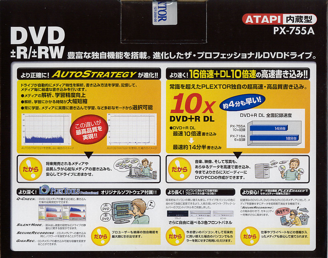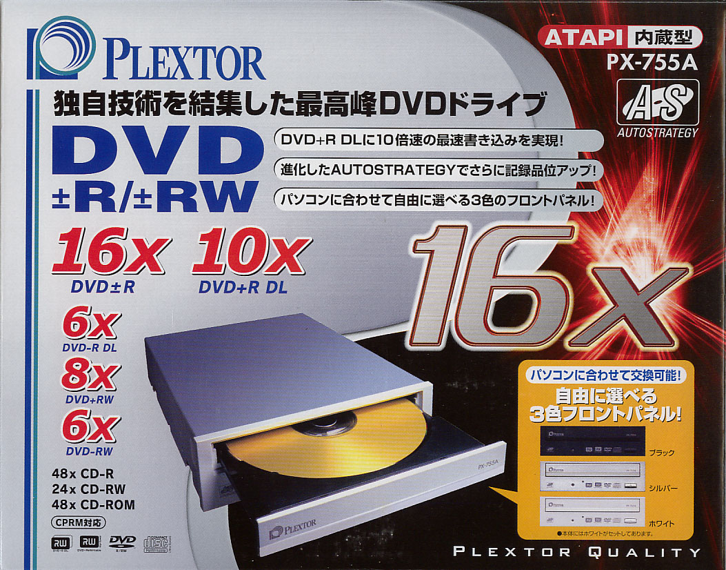 ![]() PLEXTOR PX-755A \11980 PLEXTORから発売の16xドライブ"PX-755A" 様々なメーカーがRAMへ走る中、デュアルドライブに拘り、 そして世界最速となるDVD-R 18x書込みに対応した"PX-760A"の発売を 2005年11月に予定していたPLEXTORですが、 どうも18x Burnのストラテジ調整に予想外に手間取ったのか、 はたまた良質なピックアップ等の確保に必要な選別の副産物か、 急遽PX-760Aの発売延期と共にPX-755Aというモデルが発表されました。 主なスペックとしてはDVD±Rが16x、そしてDVD+R DLが世界最速となる10xに対応します。 また、オートストラテジ機能が大きく強化されており、多様なモードが選択可能になってます。 更にライティングソフトにZulu2という他にはない特殊な逸品を添付。 さあ、待ち望んでいたPX-760Aの発売は遅れる事になってしまいましたが、 今年最後の大物です。その分いつもより余計に力入れて検証させて頂きましょう。 |
