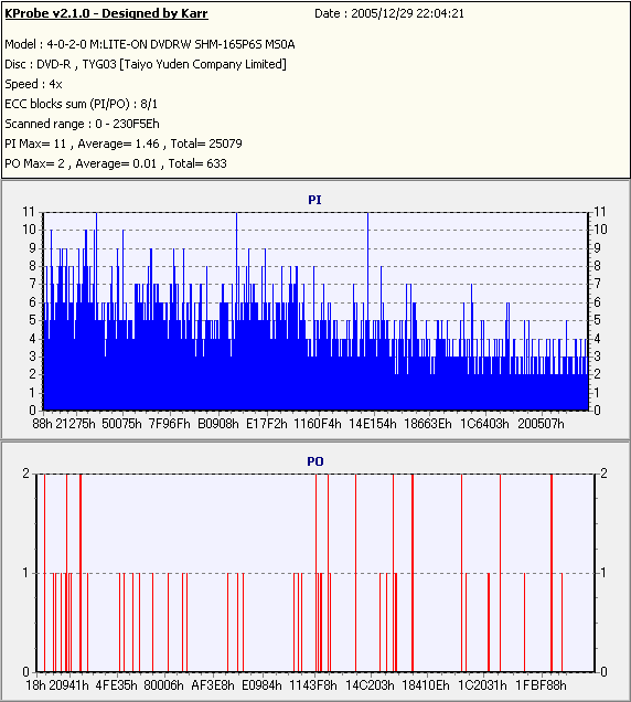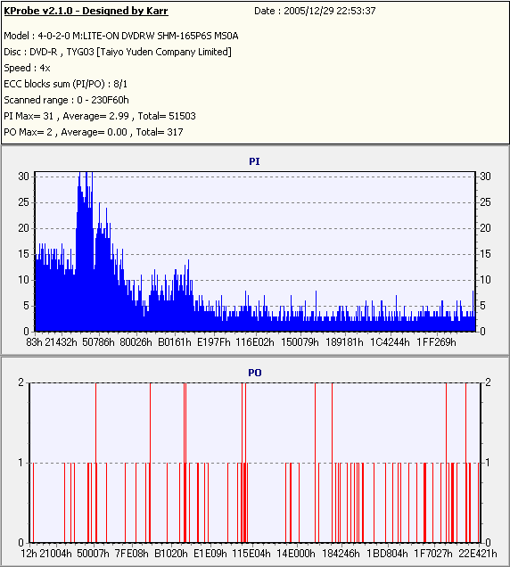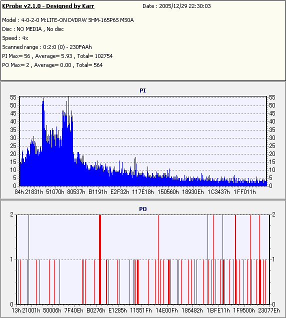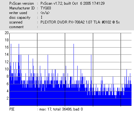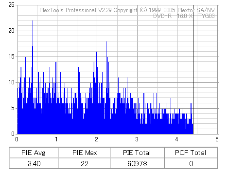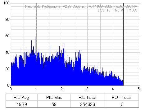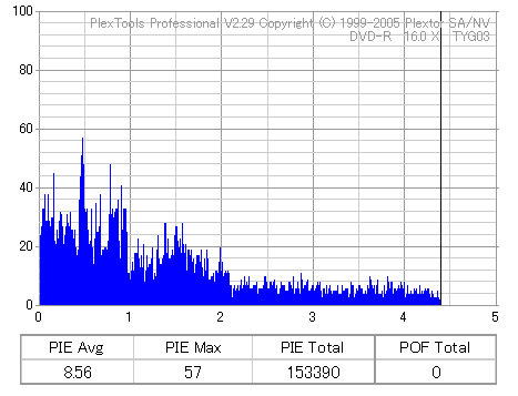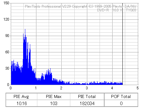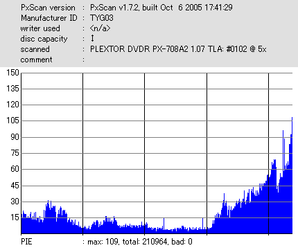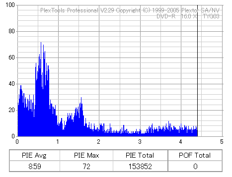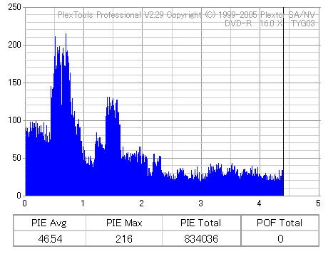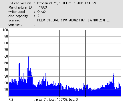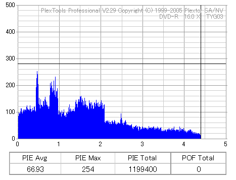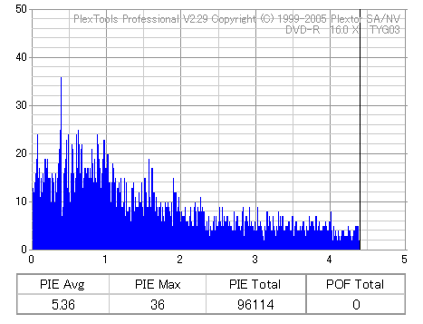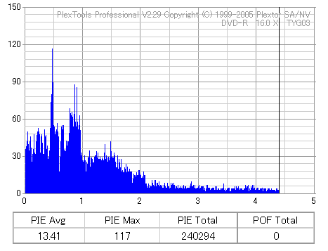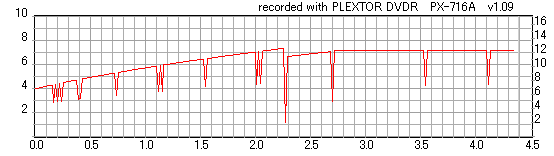 ちなみにディスクのマウント速度ですが、黒、白共に平均して約10秒強。 PX-716Aと比較するとだいたい2秒〜3秒ほど早い結果になりました。 現行のドライブの中でも結構早い方だと思います。 ![]() (本当はCDSpeedの転送レートグラフを掲載したかったんですが、例のバグによりまたも消失してしまいましたので代理) PX-716Aは16倍速を謳っておきながら、実際はPowerRecが働くため16x出る事は殆ど無いという、 正直名前だけの16xでしたが、755Aはきっちり16xまで出てます。 かなり細かいOPC動作を取っており、8x地点と12x地点で一旦書込みが停止したような動作を取ります。 (急にドライブの動作音がほとんどなくなり、そのまま数秒間停止してから書込みが再開される) ちなみに、同じディスクを716Aで焼いたときのグラフ。12xで止まってます。 ![]() 各ドライブで計測してみる PX-755A(白)で焼いたディスク(That's DVD-R 16x) ![]() PX-755A(白)で計測 ![]() PX-755A(黒)で計測 ![]() PX-716Aで計測 ![]() 予想通り、結構差が出てしまいました。黒と白では黒の方が良さそうな結果になってます。 しかし結果を見る限り、総じて716Aよりも読み品質は高そうな感じになっています。 (あんまり高すぎても今度は反対の意味で計測に支障出るんですけどね…) PX-755A(黒)で焼いたディスク(That's DVD-R 16x) ![]() PX-755A(白)で計測 ![]() PX-755A(黒)で計測 ![]() PX-716Aで計測 ![]() こちらでもやはり高エラーポイントの最大値を見ると、黒の方が結果が良くなってます。 明らかに読みの個体差っぽいですね。 また、PX-716Aでの結果とかも比べてみると、どうも焼き品質自体も黒の方が若干良くなってる気がします。 結構強烈なOPC動作を行うドライブみたいですんで、読み性能に優れてた方が綺麗に焼けるんでしょうか。 (参考)PX-716Aで焼いたディスク(That's DVD-R 16x) ![]() PX-755A(白)で計測 ![]() PX-755A(黒)で計測 ![]() PX-716Aで計測 ![]() 速度自体は12xで頭打ちになってるとはいえ、内周の方の焼き品質は755Aより良いですね。 ただ単にメディアの適正の問題なのか、それともやはりストラテジの問題なのか。 もうちょっと755Aには改善の余地はある気がしますが、それはおいおい少しずつ良くなっていくんでしょう。 ちなみにここでもやはり黒の方が良い結果になってます。 DW1640での計測結果 PX-760A(白) ![]() PX-760A(黒) ![]() PX-716A ![]() DW1640の計測では716Aと755Aの差はあまりありません。 が、ここでも白で焼いたのと黒で焼いたのの差が……これは、結構目立つかもしれませんね。 PX-708A2での計測 716A ![]() 755A(白) ![]() 755A(黒) ![]() これ見てるとどうも716A計測でやたらとエラー高いのは読みの相性があるんじゃないかって気がしてきます。 しかし、…見事に個体差出てますね。(っていうか、2台買って2台とも素晴らしかったらどうしよう使い道ねーとか思ったんですが…w) 白版は外周がちょっときつそうです。 kprobeでも計測 716A 755A(白) 755A(黒) やはり高エラーポイントでのエラー値が違ってきます。 と、一通り試したのでこの辺で終了。今回は白、黒両方の書込みチェックを行いますんで、残りはそっちで。 |
