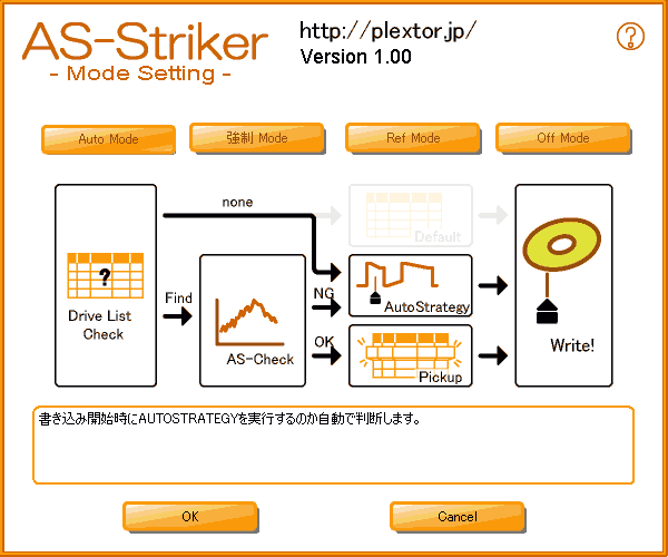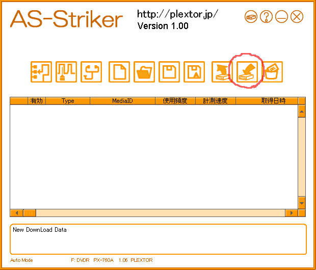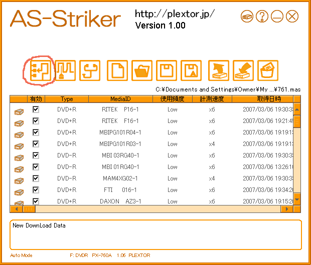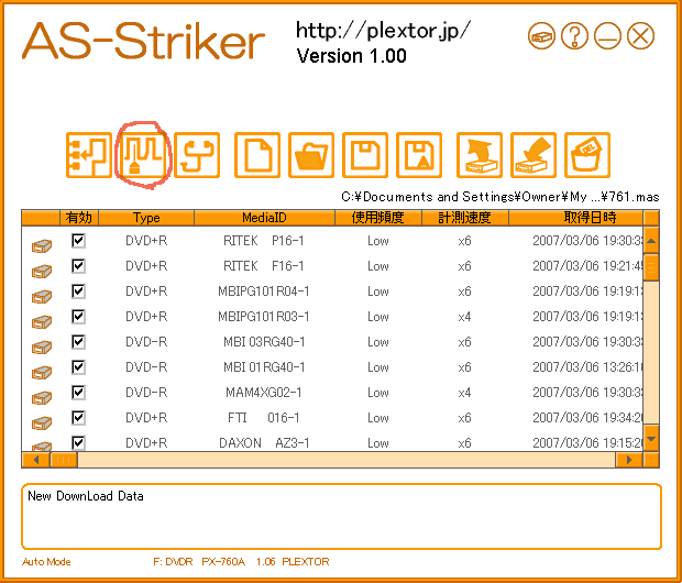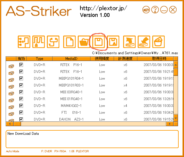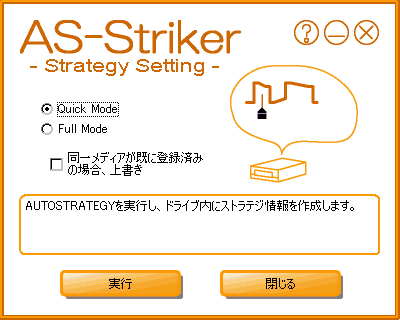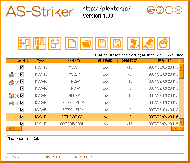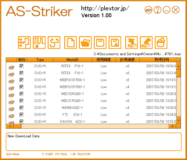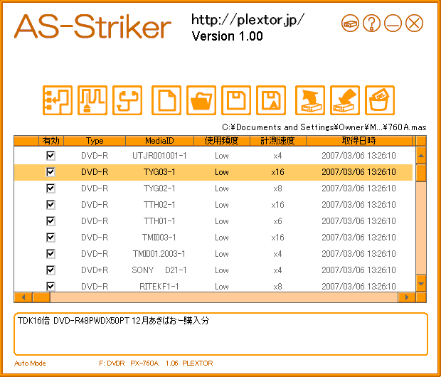 AS-Strikerとは、プレクスター様のwebサイトで公開されたAutoStrategyの管理ツールです。 AS-Strikerで何が出来るのかというと・・・・・・ ・ドライブ内に保存されたASデータベースをファイルとして書き出す。 ドライブに登録されたストラテジをドライブ外に読み出し、ASデータベースの登録上限数を超えて管理できます。また、ストラテジの生成日時や番号なども付加されるため、同一のメディアに対して複数のストラテジを作成した際に両者の判別が可能になっています。 更にHDDに書き出せるという特性上、複数台のドライブで作成したストラテジを共有することも可能です。 ・ファイルとして書き出されたASをドライブに再登録。 AS-Striker上で管理されているストラテジを任意に選択してドライブ内のASデータベースへ再登録することができます。 普通にドライブを使ってるユーザーにとってはあまり関係ないツールかもしれませんが、AutoStrategyの要素が大きく関与するPX-760A以降の型番のDVDドライブではASを使いこなそうとするとどうしてもフルモードでのストラテジ作成や、複数の同一ストラテジの管理などを行う場面が出てきます。今までのPTPの機能ではこれらの管理についてかなり不十分な点があり、折角作成したストラテジを無駄にしてしまうようなことがありましたが、このツールはその辺りの不満を上手い具合に解決してくれる、エキスパートユーザーを対象にしたツールだと思います。 |