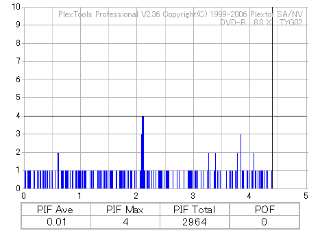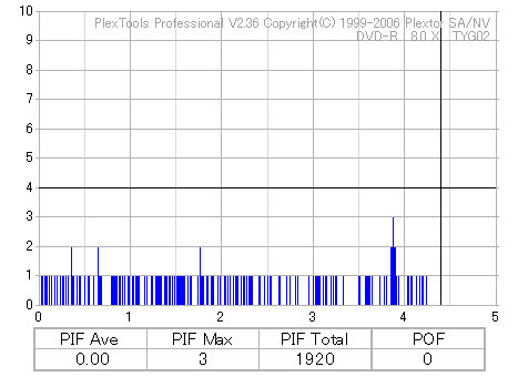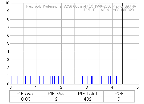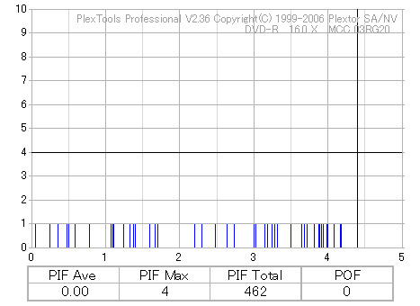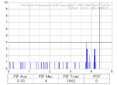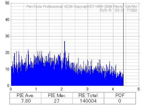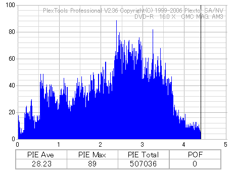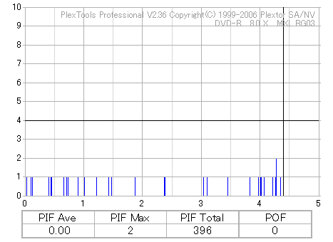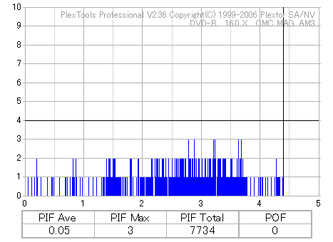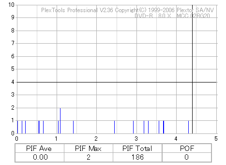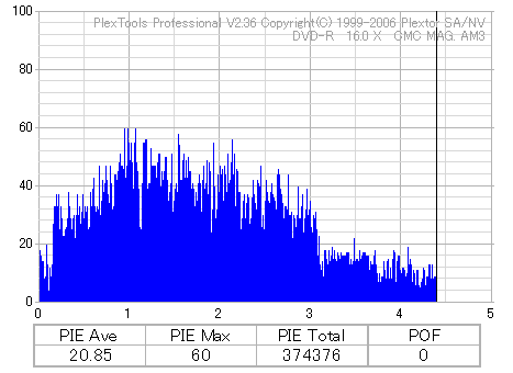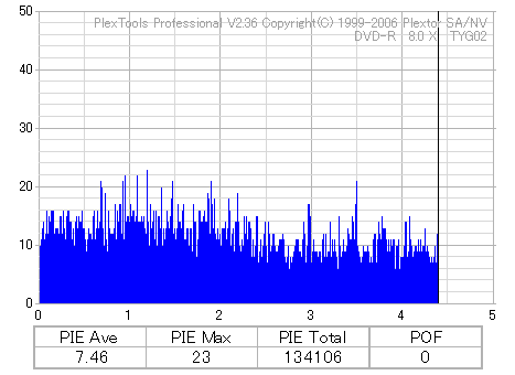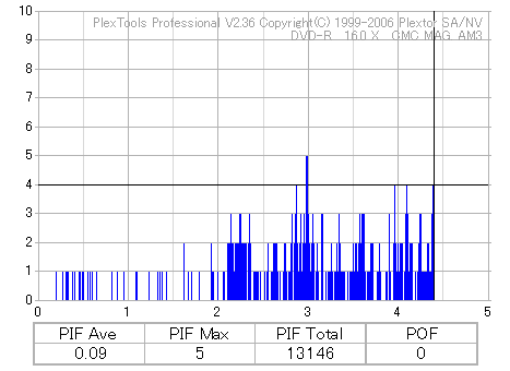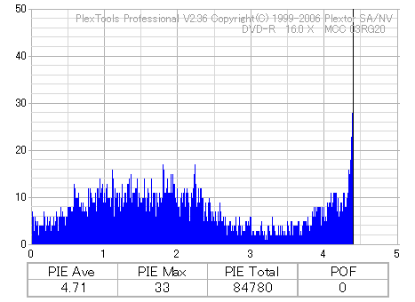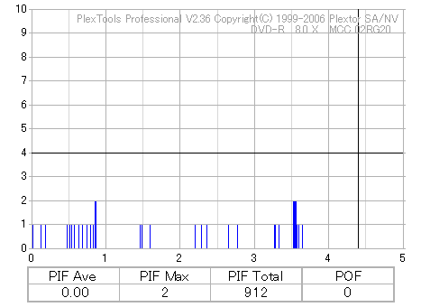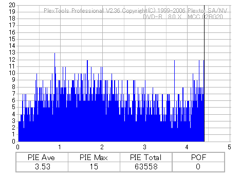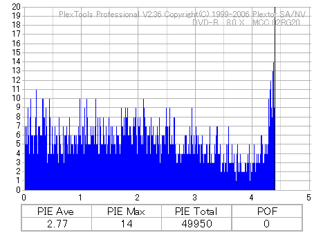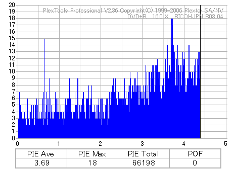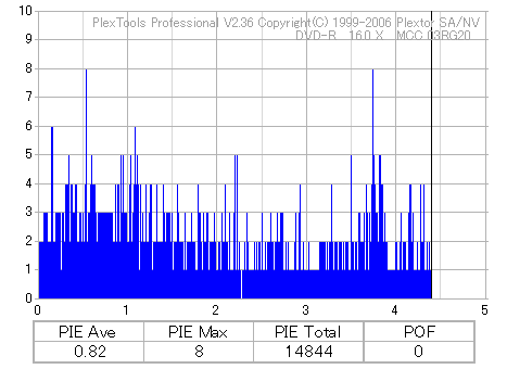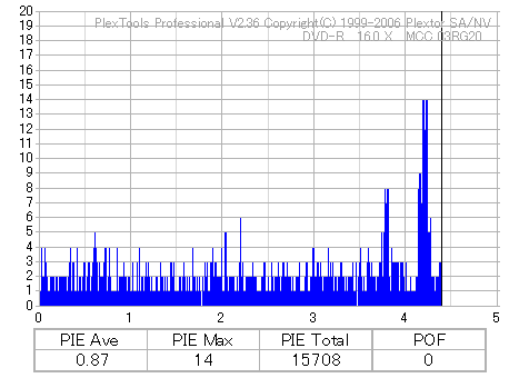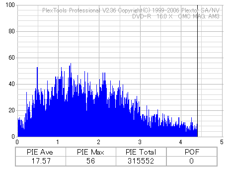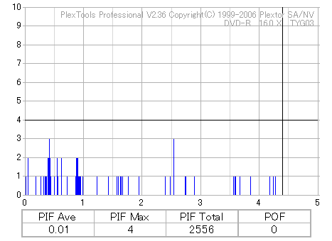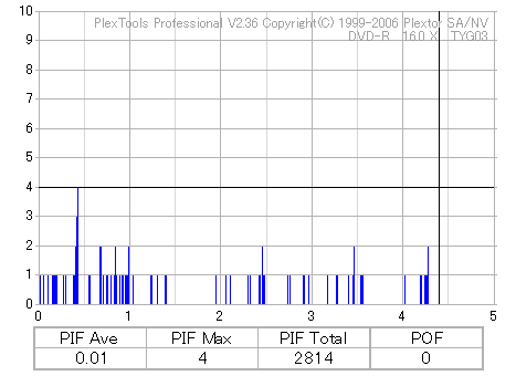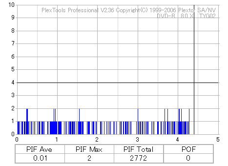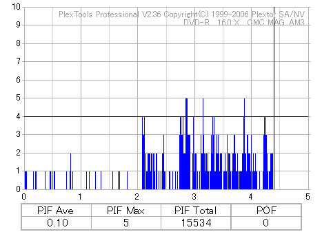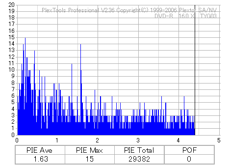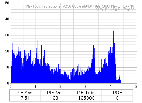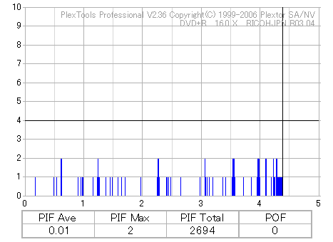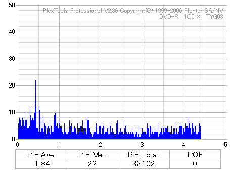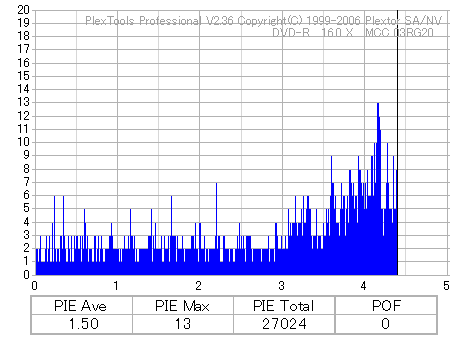 エラー値はまあまあで、どの速度で焼いてもそれなり程度には使えそうです。 欠点はややPIFが多めな所ですが、これは明らかにメディア依存なのでドライブのせいではないでしょう。 低速で焼いてもそんなにエラーやJitterが改善されたりしてる様子はない上、外周の方は高速向けにチューンされてるのか8倍以下だと外周PIFが多く出てしまうので、 安物ですし思い切って16倍速で焼ききってしまった方がよさそうな気がします。