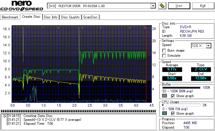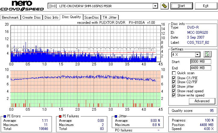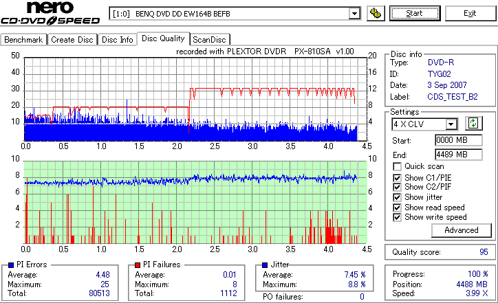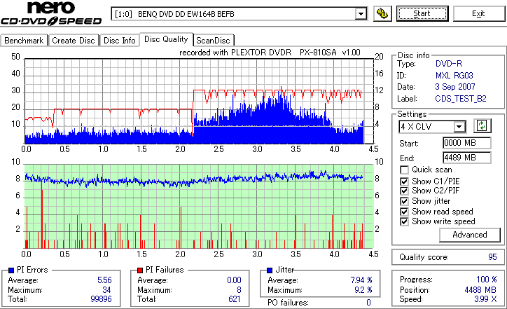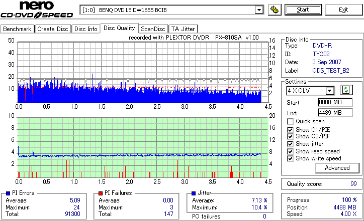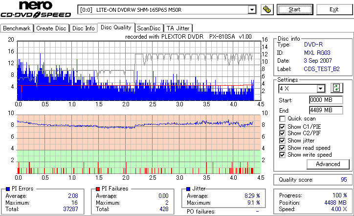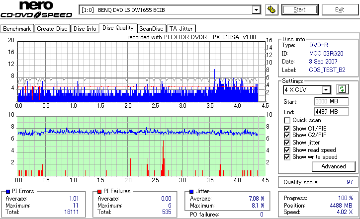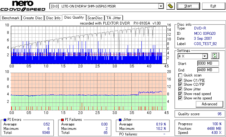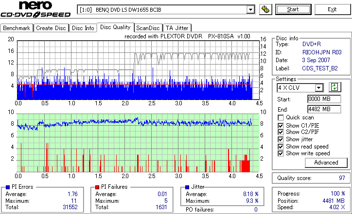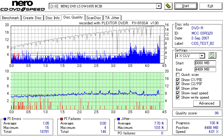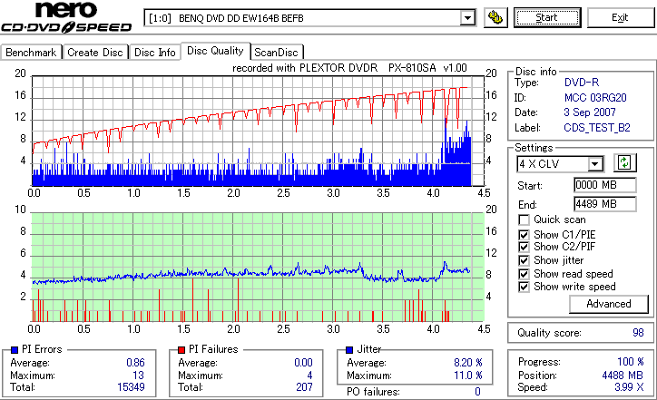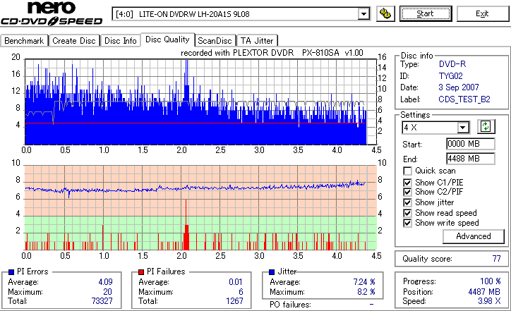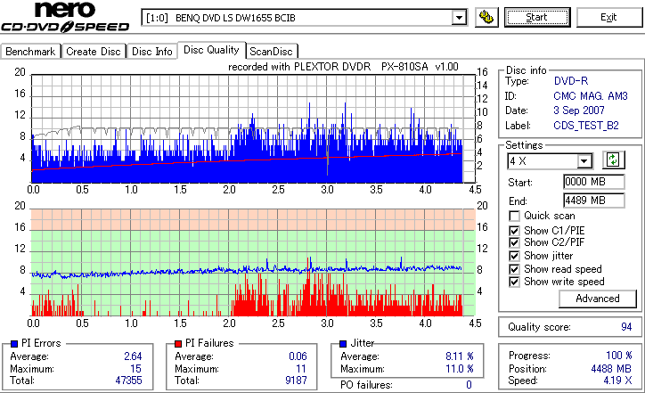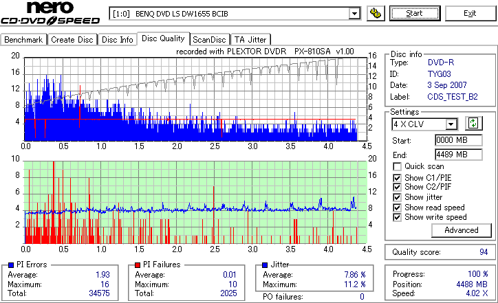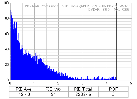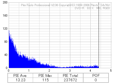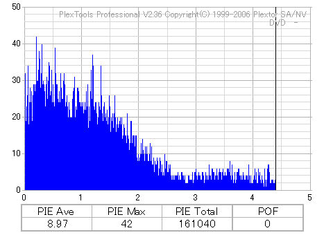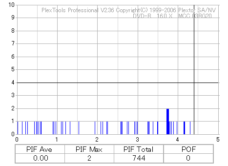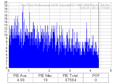 エラー値はまあまあで、どの速度で焼いてもそれなり程度には使えそうです。 欠点はややPIFが多めな所ですが、これは明らかにメディア依存なのでドライブのせいではないでしょう。 低速で焼いてもそんなにエラーやJitterが改善されたりしてる様子はない上、外周の方は高速向けにチューンされてるのか8倍以下だと外周PIFが多く出てしまうので、 安物ですし思い切って16倍速で焼ききってしまった方がよさそうな気がします。