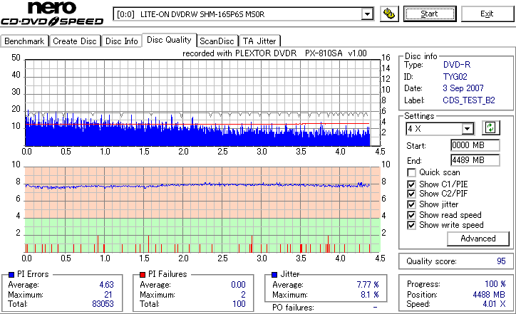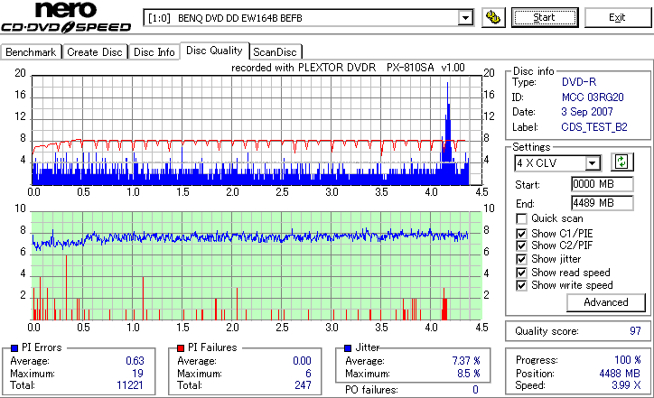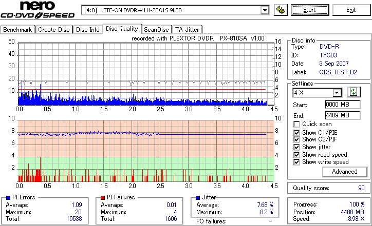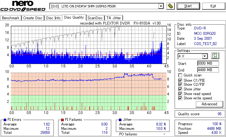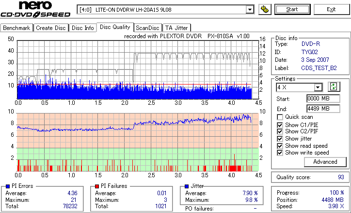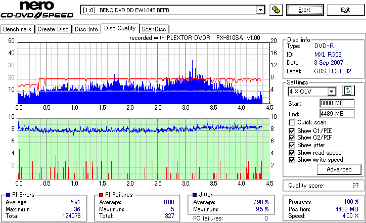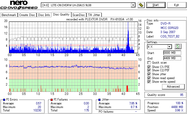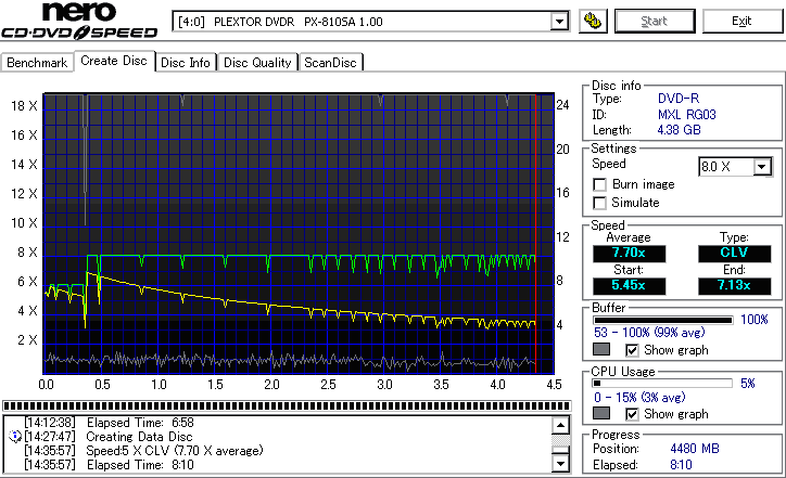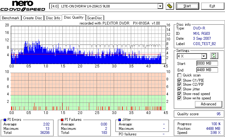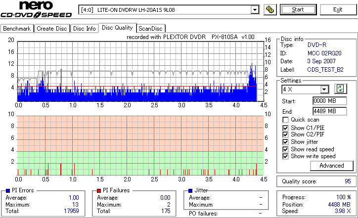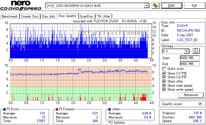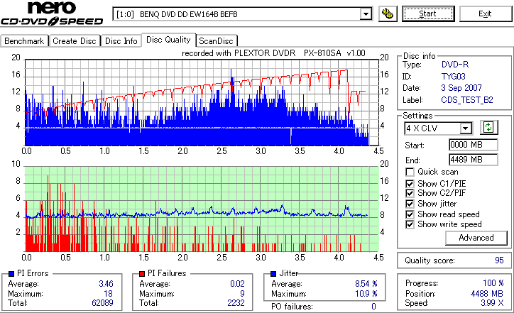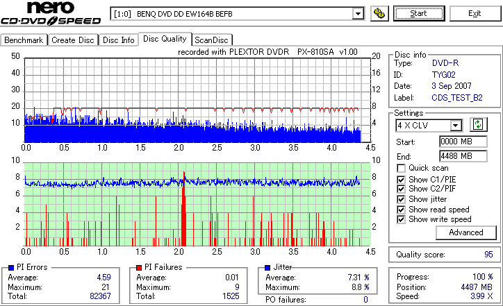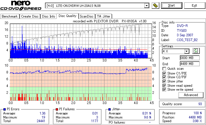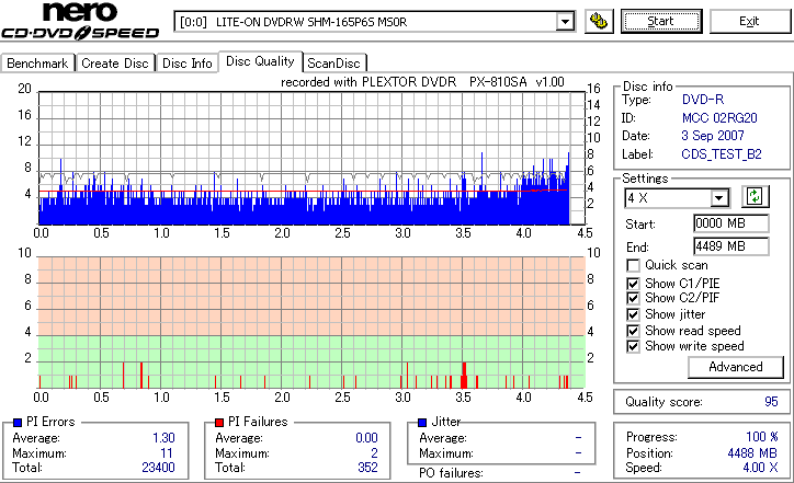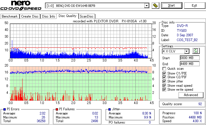 エラー値はまあまあで、どの速度で焼いてもそれなり程度には使えそうです。 欠点はややPIFが多めな所ですが、これは明らかにメディア依存なのでドライブのせいではないでしょう。 低速で焼いてもそんなにエラーやJitterが改善されたりしてる様子はない上、外周の方は高速向けにチューンされてるのか8倍以下だと外周PIFが多く出てしまうので、 安物ですし思い切って16倍速で焼ききってしまった方がよさそうな気がします。