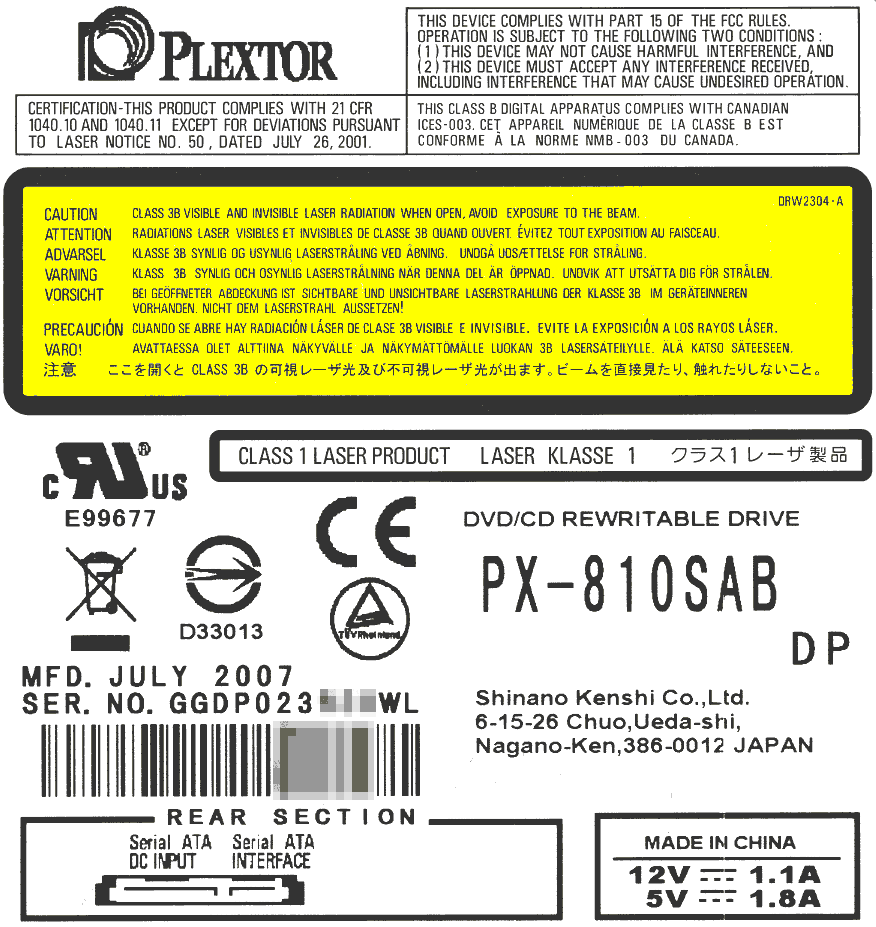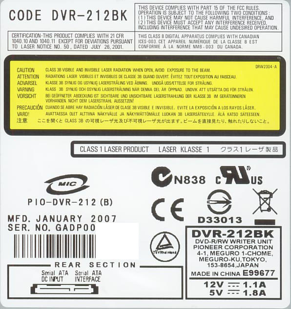 ![]() 外観。ちなみに長野発でもないしシナノケンシが設計してるわけでもありません。 ![]() ラベル画像はクリックで拡大画像表示。 しかしこのラベル、DVR-212のラベルの一部分だけ書き換えたって感じで後の部分は殆ど同じですね。 (DVR-212のラベル画像) ![]() ベゼルデザインはイジェクトボタンやLED、イジェクトホールの位置なんかはPioneerのDVR-212と同じです。 ただ、白文字での印刷がありベゼルの質感も若干本家とは違うため、遠目には同ドライブだとは判らないと思います。 ごく個人的な感想を述べさせて頂くと、どっちかというとこちらの方が好み。 PX-810SA / DVR-212 ![]() ![]() 基盤画像。左がPX-810SAで右がDVR-212。殆ど差は無いです。 |