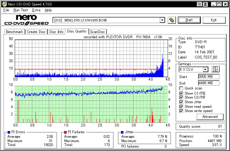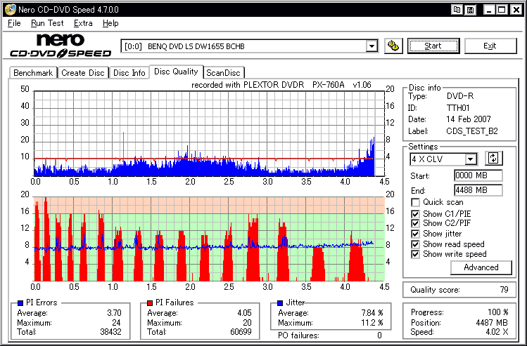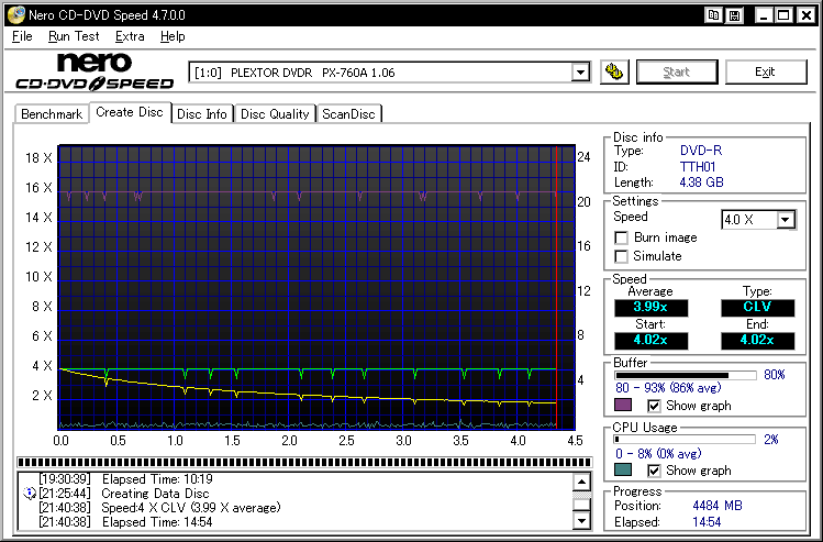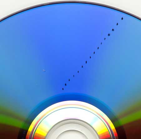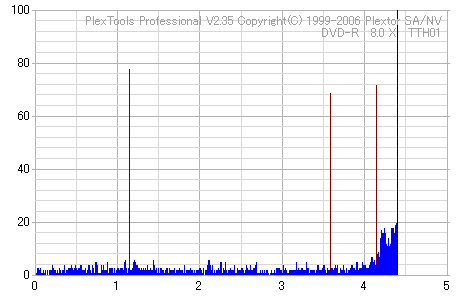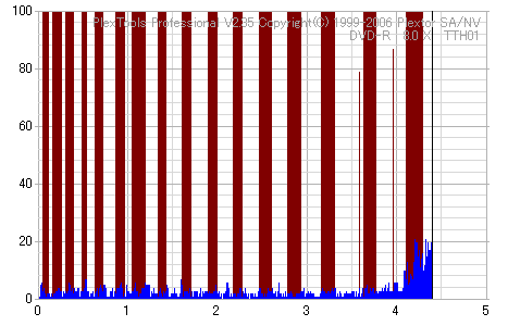※補足・キズや汚れなどのバーストエラーがPIEとしてではなく、PIFとして大きく検出される理由 DVDをよくレンタルしてご覧になる方や、ご自宅にお子様を飼ってらっしゃる方(すげぇ言い方だ…)はよく身にしみて判ると思うんですが、DVDの記録面にキズや汚れが付いて映像の再生がひっかかるようになることってあると思います。キズや汚れに対する読み性能については前回のテストで実験致しました。 さて、DVDに記録されたデータというのは、そもそもが動画像などの大きなデータを連続して読み取る事を想定して記録されています。そのためDVD-Rディスクなどはシーケンシャルなアクセスを得手とし、逆にランダムアクセスを苦手としているわけですが…何が言いたいかというと、つまりストリーミングなデータの読み出しに対応するため、データはディスクの内側から外側に向かってらせん状に記録されているということです。 DVDディスクのトラックピッチは0.72μm、そしてデータの記録トラックはディスクの中心から約2.3cm〜5.8cmの間、だいたい35mmの幅に配置されています。するってーと35000/0.72で約48000。トラックは記録面上に約48000周分配置されていることになり、だいたいDVDの記録面のトラックの長さは12kmぐらいになるんだなと逆算できます。 対してディスクいっぱいに記録した際に記録されるECCブロックの数は約140000ブロックほど、すると1つのECCブロックの長さはだいたい8.5cm程度になりますね。つまり最内周の部分であっても、1つの1ECCブロックが2周にまたがって配置されていることはないわけです。 更に逆算すると、ECCブロック内の1本のROWは約0.4mmの長さしか持っていないことになりますので、ちょっとしたキズが付いたらROWは1本まるごと潰れてしまいますね。ROWが1本潰れると、その部分で確実にPIEとPIFが1ずつ発生してしまいます。PIEは8ECC sumで計測されますし、元々色んな所で結構発生しているものなので1くらい増えたところであまり増えたように感じませんが、PIFは1ECC Sumで計測される上にそんなに大量に発生するものではありませんので、PIFに比べて大きく増えたように感じるわけです。 さて、ROWが1本や2本潰れたところでECCブロック内は2次元構造をしているため、PIでの修復はできずともPOによって修復が行われます。しかしこれが数十本潰れたとなるとさすがに修復は難しくなってきます。この特性により、DVDディスクはトラックに対して縦方向、つまり放射状のキズには強いですが、トラックと水平方向、つまり円周状のキズには滅法弱いのです。ディスクを拭く際に放射状に拭いた方が良いのは、汚れを拭き取った際に円周状にキズが付くとまずいからです。 |