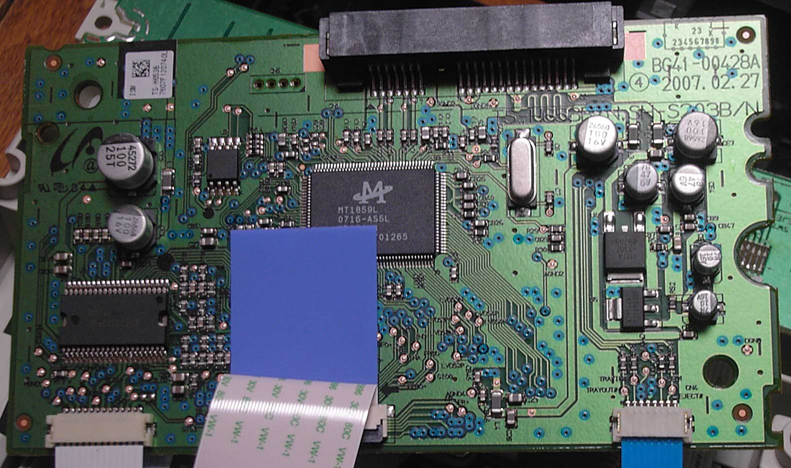 ![]() ![]() ラベル、およびボディデザイン。ラベルはクリックで拡大します。 天板の凹凸は従来までの東芝サムスンとほぼ同じですが、裏側にかなり深い凹みがあるのが目を引きます。 2007年6月製造。消費電力の表記はなく、製造国はインドネシアでした。 ![]() ベゼルデザインはいつものサムスン WriteMasterのベゼルです。 しかし国内で販売されているのは東芝サイドのベゼルが多いので、このタイプのベゼルは 国内では一部のバルクモデルやDELLの初期装備ドライブとかでしか見られないのが現状です。 ![]() ![]() 基盤画像。両方ともクリックで拡大(画像右は展開表示)します。 LITEONのDH-20A3xシリーズと同じく、MediaTek社のMT185xシリーズのSATA版であるMT1859Lを採用しています。 メモリ内臓チップであるため基板上にメモリチップは見られず、裏側のカバーをはずしただけではチップの姿は見られません。 時にこのMT1859Lチップ、LITEONのDH-20A3PやAD-7190Aに搭載されているものよりもスリムでコンパクトなサイズになってます。 これがMT1858LとMT1859のチップ仕様の差なのか、それともドライブ間の差なのかは不明です。 しかしDH-20A3Pの頃から思ってたんですが、基盤の裏側に配置してるチップって放熱どうするんだろう。 最近のドライブって熱伝導用のシリコンゴムみたいなの挟んで金属カバーから熱逃がすのが普通だと思うんですが・・・ |