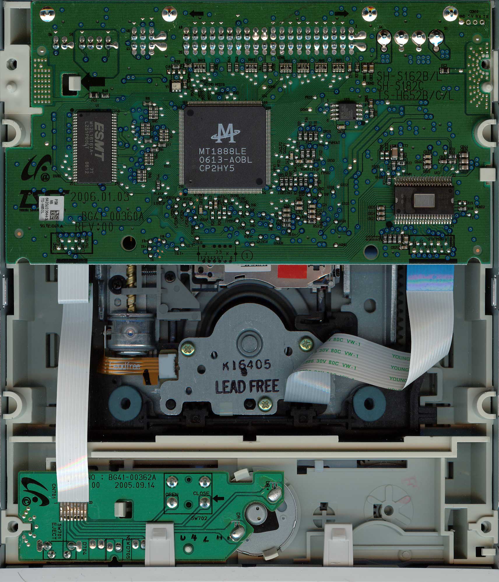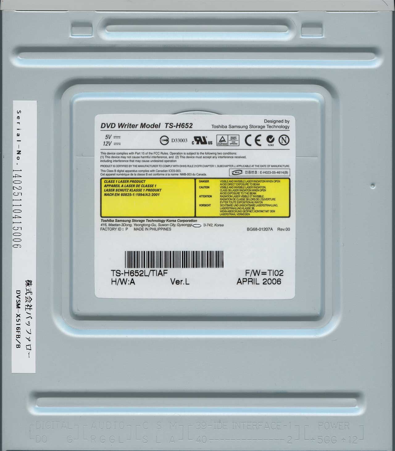 ![]() ベゼルデザインはサムスン製のデザインとは違い、NECに近いタイプです。 中央にLightScribeのロゴが。 ![]() クリックで拡大します。シリアルが掲載されてますがこの数値は無効なので悪しからず。 消費電力の表記欄はあるものの、肝心の数値での表記はされていません。 製造日はApril 2006(2006年4月)で、原産国表記はMADE IN PHILIPPINES(フィリピン製) ![]() クリックで拡大します。 採用チップはMediaTekのMT1888LE。 ピックアップデバイス部分にLEAD FREEと書かれてます。 |