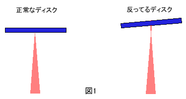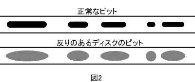 - ピックアップと記録面のズレはグルーブ追跡すればいい話ですけれども、反りのせいでレンズと記録面の傾斜だとか距離の差だとかも発生してしまうわけで、その所為で焦点がズレてピットがぼけたりすると、エラーは高くないんだけどJitterだけ悪いとかいう状況は起こり得ます。[図1,2参照...カナリテキトーな図ですが(汗]