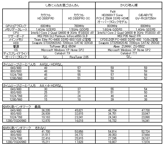 (palitは迷いもせずに見つけたら速攻でポチしましたが(汗)) それで、 「2600XT GDDR3版のクロックが800/700なので、恐らくはそれにかなり迫るパフォーマンスを出せると思います。」が どれくらいなのかを確認するために?比較ベンチをとってみたので結果をあげさせていただきます。 参考までに。