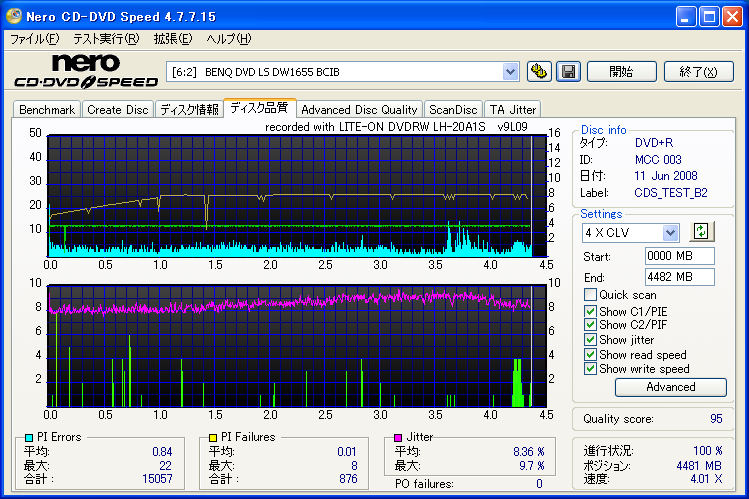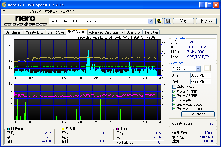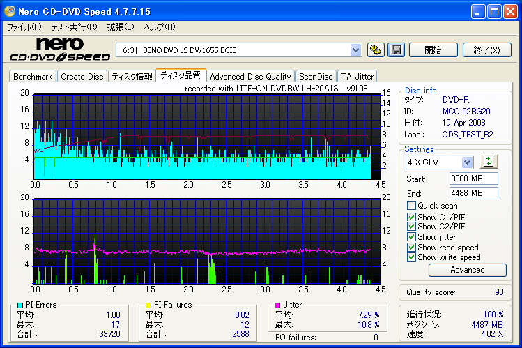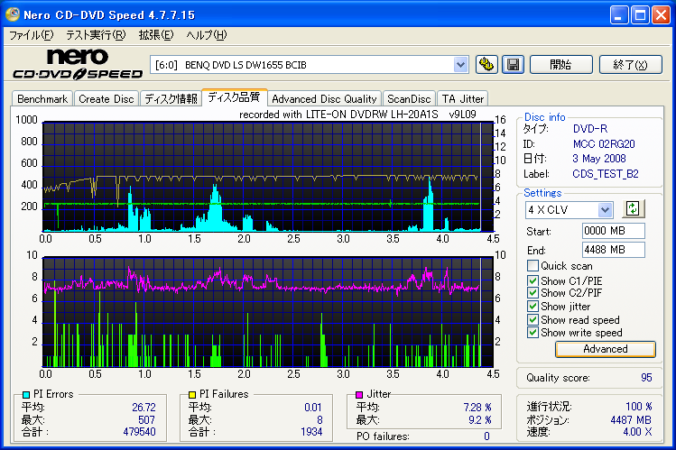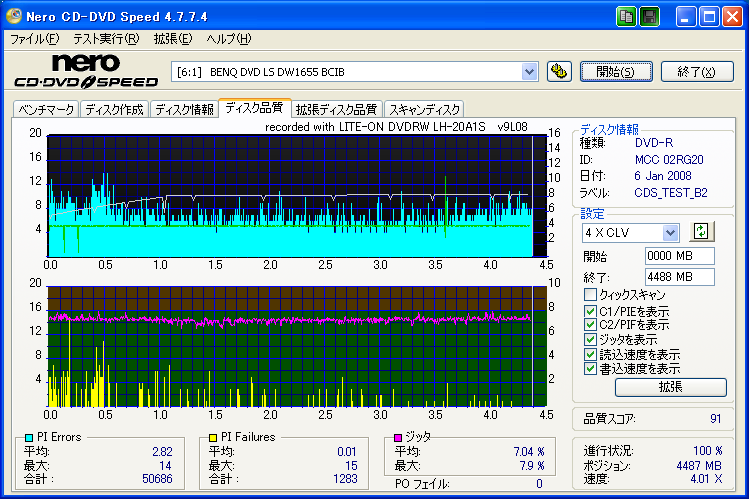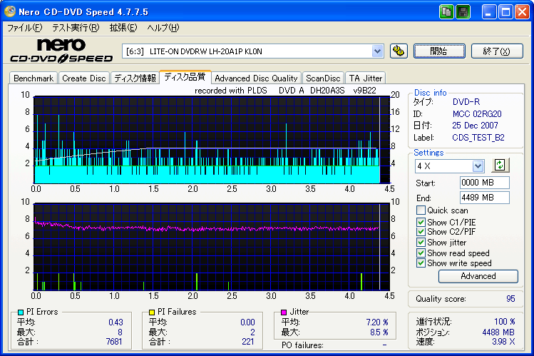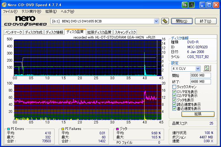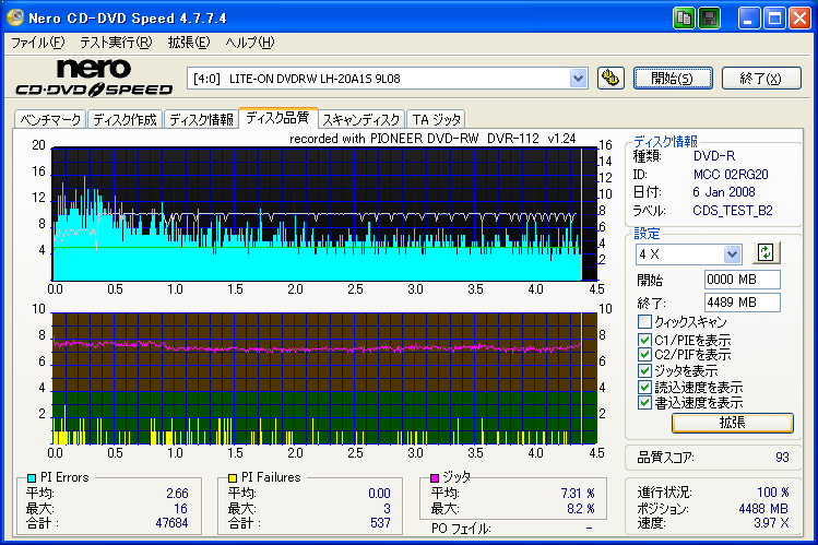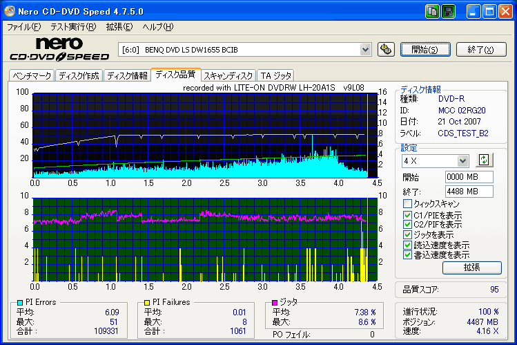 【メディア名】三菱 美画創 DVD-R 1-8x [CMC委託] (MCC 02RG20) 【焼きドライブ】DH-20A3S 【焼き速度】 8x指定 【焼きソフト】Nero CD-DVD Speed 【計測ソフト】Nero CD-DVD Speed 【計測ドライブ】LH-20A1P(PIE/PIF/J) 【計測ドライブ】BenQ DW1640(PIE/PIF/J) ※Force Hyper Tuning:ON ※Online Hyper Tuning :OFF